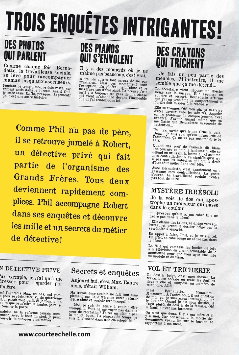 Comme Phil n'a pas de père, il se retrouve jumelé à Robert, un détective privé qui fait partie de l'organisme des Grands Frères. Tous deux deviennent rapidement complices. Phil accompagne même Robert dans ses enquêtes et découvre tous les secrets du métier de détective! Ce volume comprend Des photos qui parlent, Des pianos qui s'envolent et Des crayons qui trichent.