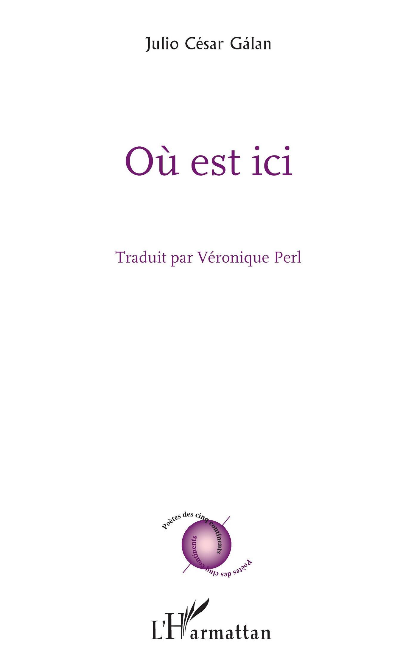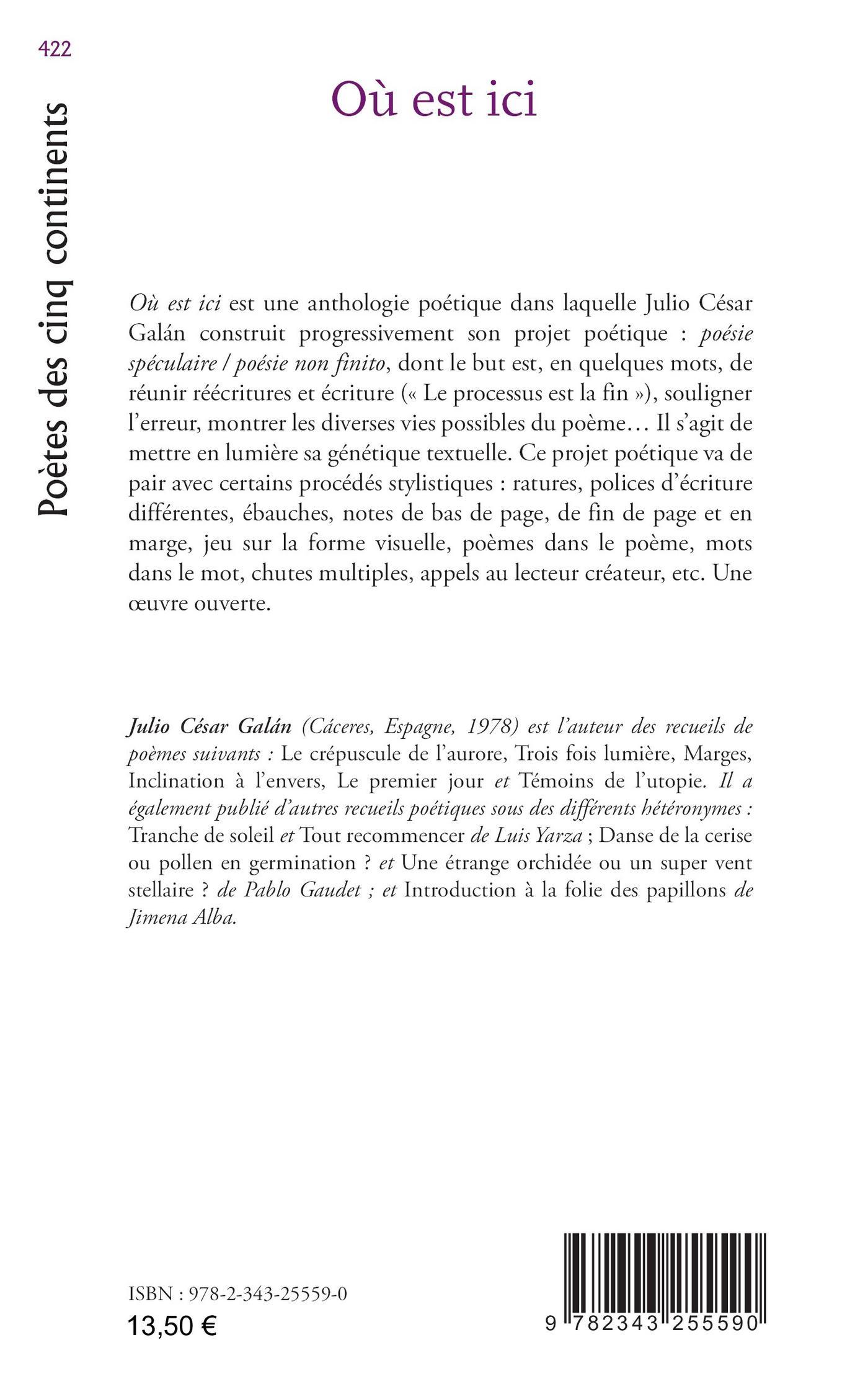 Où est ici est une anthologie poétique dans laquelle Julio César Galán construit progressivement son projet poétique : poésie spéculaire / poésie non finito, dont le but est, en quelques mots, de réunir réécritures et écriture, souligner l’erreur, montrer les diverses vies possibles du poème… Il s’agit de mettre en lumière sa génétique textuelle. Ce projet poétique va de pair avec certains procédés stylistiques : ratures, polices d’écriture différentes, ébauches, notes de bas de page, de fin de page et en marge, jeu sur la forme visuelle, poèmes dans le poème, mots dans le mot, chutes multiples, appels au lecteur créateur, etc. Une œuvre ouverte.