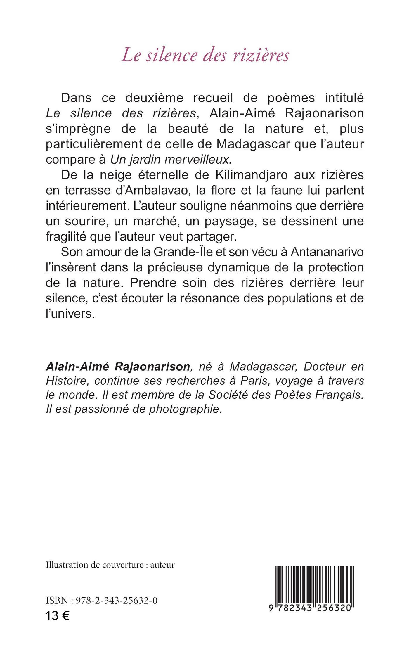 Dans ce deuxième recueil de poèmes intitulé Le silence des rizières, Alain-Aimé Rajaonarison s’imprègne de la beauté de la nature et, plus particulièrement, de celle de Madagascar que l’auteur compare à Un jardin merveilleux. De la neige éternelle de Kilimandjaro aux rizières en terrasse d’Ambalavao, la flore et la faune lui parlent intérieurement. L’auteur souligne néanmoins que derrière un sourire, un marché, un paysage, se dessine une fragilité que l’auteur veut partager. Son amour de la Grande-Île et son vécu à Antananarivo l’insèrent dans la précieuse dynamique de la protection de la nature. Prendre soin des rizières derrière leur silence, c’est écouter la résonance des populations et de l’univers.