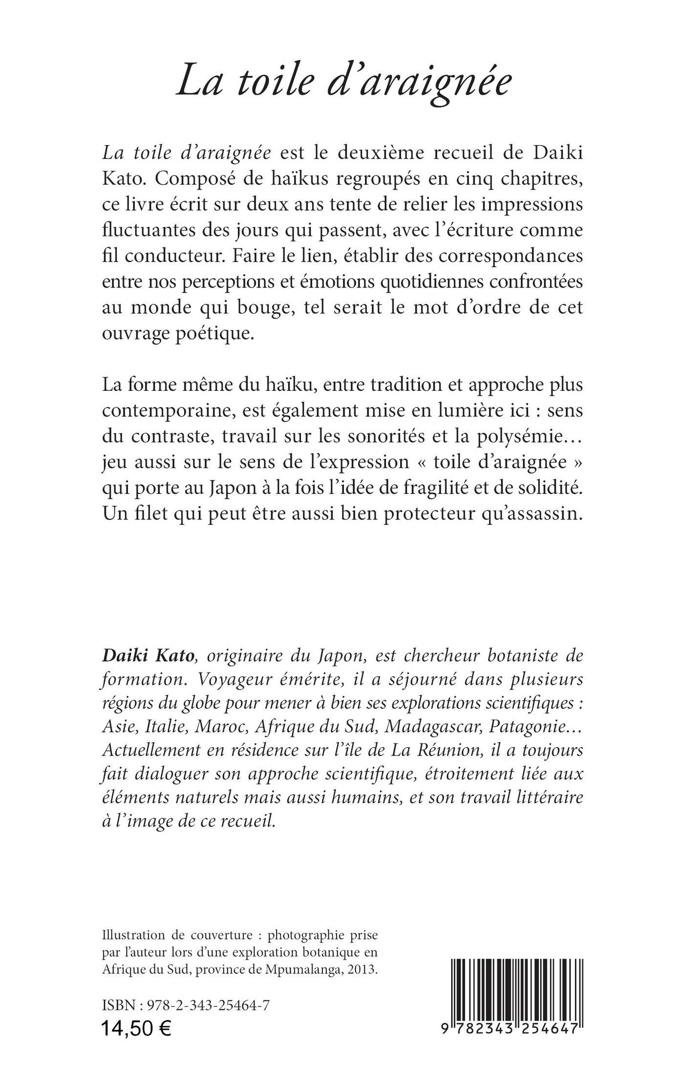 Composé de haïkus regroupés en cinq chapitres, ce recueil tente de relier les impressions fluctuantes des jours qui passent, avec l’écriture comme fil conducteur. Faire le lien, établir des correspondances entre nos perceptions et émotions quotidiennes confrontées au monde qui bouge, tel serait le mot d’ordre de cet ouvrage poétique. La forme même du haïku, entre tradition et approche plus contemporaine, est également mise en lumière ici : sens du contraste, travail sur les sonorités et la polysémie… jeu aussi sur le sens de l’expression « toile d’araignée » qui porte au Japon à la fois l’idée de fragilité et de solidité. Un filet qui peut être aussi bien protecteur qu’assassin.