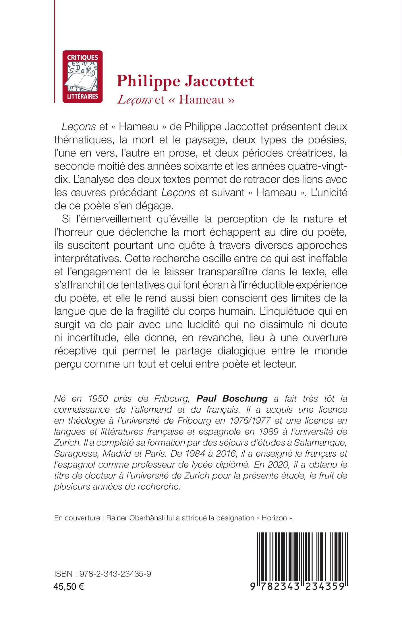 Leçons et « Hameau » de Philippe Jaccottet présentent deux thématiques, la mort et le paysage, deux types de poésies, l’une en vers, l’autre en prose, et deux périodes créatrices, la seconde moitié des années soixante et les années quatre-vingt-dix. L’analyse des deux textes permet de retracer des liens avec les oeuvres précédant Leçons et suivant « Hameau ». L’unicité de ce poète s’en dégage. Si l’émerveillement qu’éveille la perception de la nature et l’horreur que déclenche la mort échappent au dire du poète, ils suscitent pourtant une quête à travers diverses approches interprétatives. Cette recherche oscille entre ce qui est ineffable et l’engagement de le laisser transparaître dans le texte, elle s’affranchit de tentatives qui font écran à l’irréductible expérience du poète, et elle le rend aussi bien conscient des limites de la langue que de la fragilité du corps humain. L’inquiétude qui en surgit va de pair avec une lucidité qui ne dissimule ni doute ni incertitude, elle donne, en revanche, lieu à une ouverture réceptive qui permet le partage dialogique entre le monde perçu comme un tout et celui entre poète et lecteur.