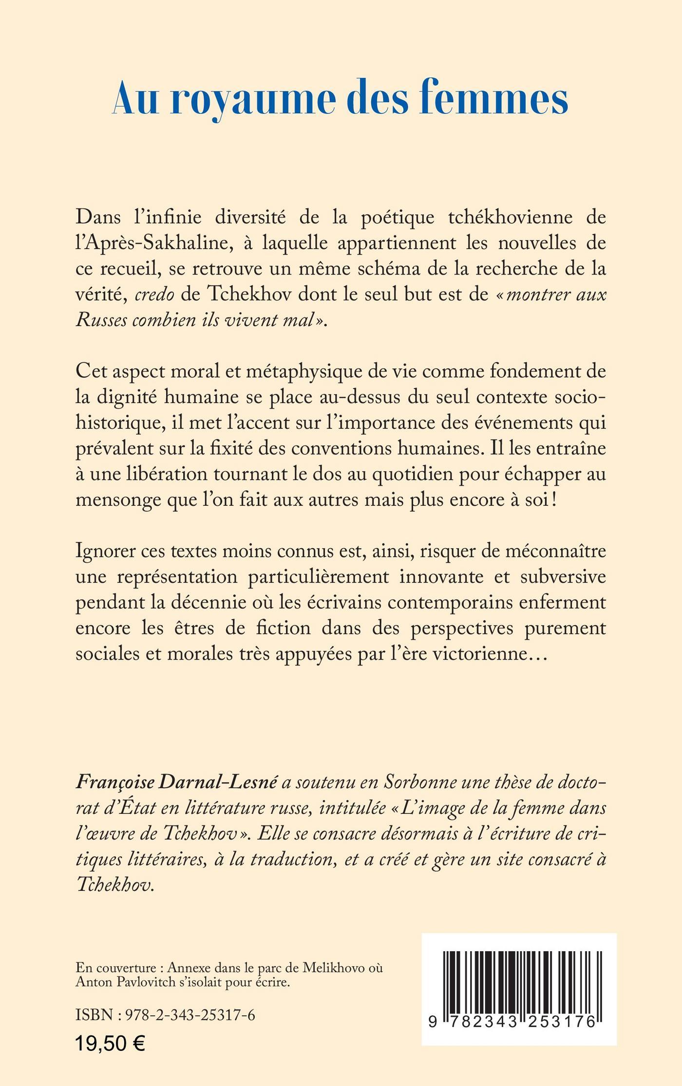 Dans l’infinie diversité de la poétique tchékhovienne de l’Après-Sakhaline, à laquelle appartiennent les nouvelles de ce recueil, se retrouve un même schéma de la recherche de la vérité, credo de Tchekhov dont le seul but est de «montrer aux Russes combien ils vivent mal». Cet aspect moral et métaphysique de vie comme fondement de la dignité humaine se place au-dessus du seul contexte sociohistorique, il met l’accent sur l’importance des événements qui prévalent sur la fixité des conventions humaines. Il les entraîne à une libération tournant le dos au quotidien pour échapper au mensonge que l’on fait aux autres mais plus encore à soi !