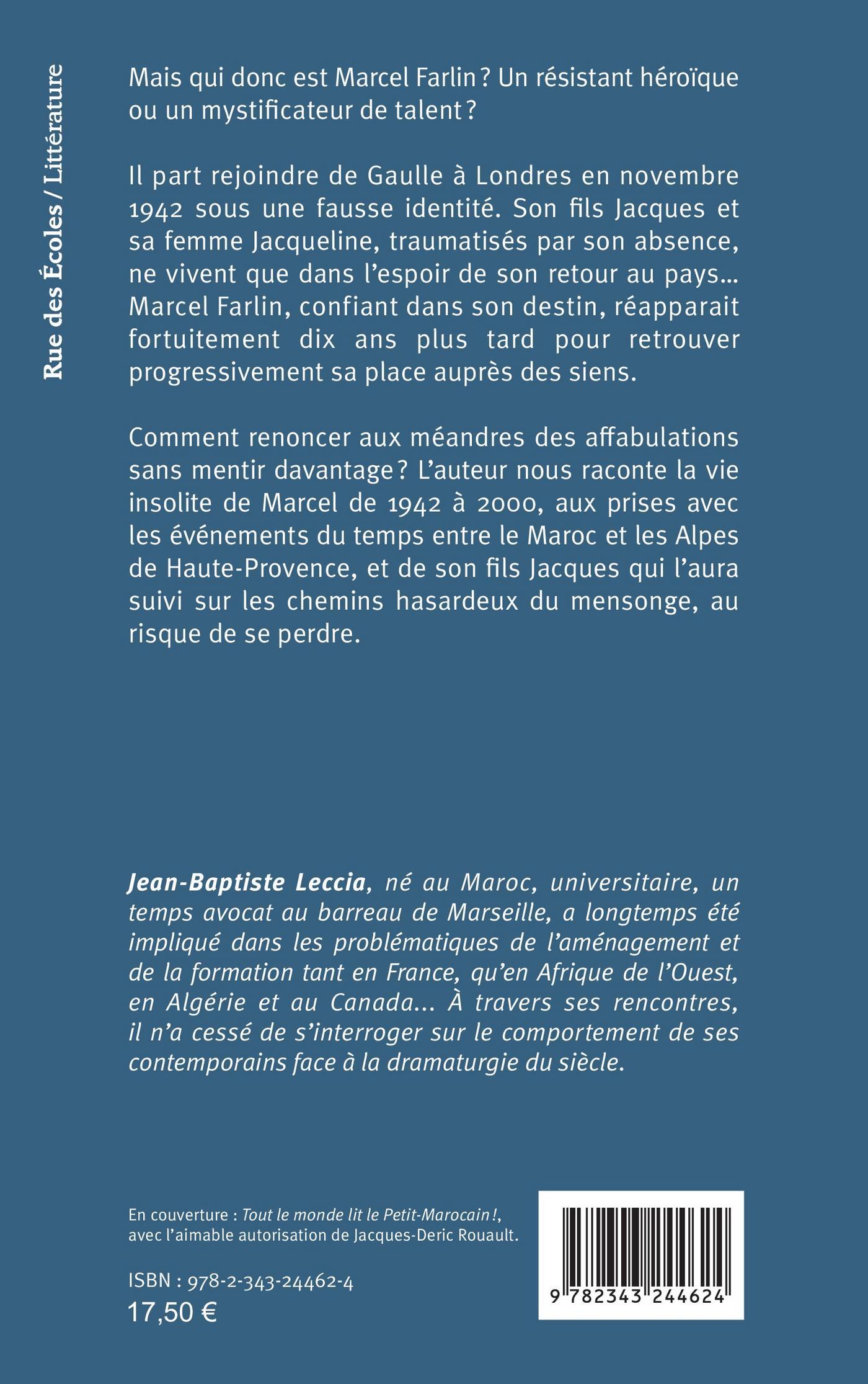 Mais qui donc est Marcel Farlin ? Un résistant héroïque ou un mystifi cateur de talent ? Il part rejoindre de Gaulle à Londres en novembre 1942 sous une fausse identité. Son fils Jacques et sa femme Jacqueline, traumatisés par son absence, ne vivent que dans l’espoir de son retour au pays... Marcel Farlin, confiant dans son destin, réapparait fortuitement dix ans plus tard pour retrouver progressivement sa place auprès des siens. Comment renoncer aux méandres des affabulations sans mentir davantage ? L’auteur nous raconte la vie insolite de Marcel de 1942 à 2000, aux prises avec les événements du temps entre le Maroc et les Alpes de Haute-Provence, et de son fils Jacques qui l’aura suivi sur les chemins hasardeux du mensonge, au risque de se perdre.