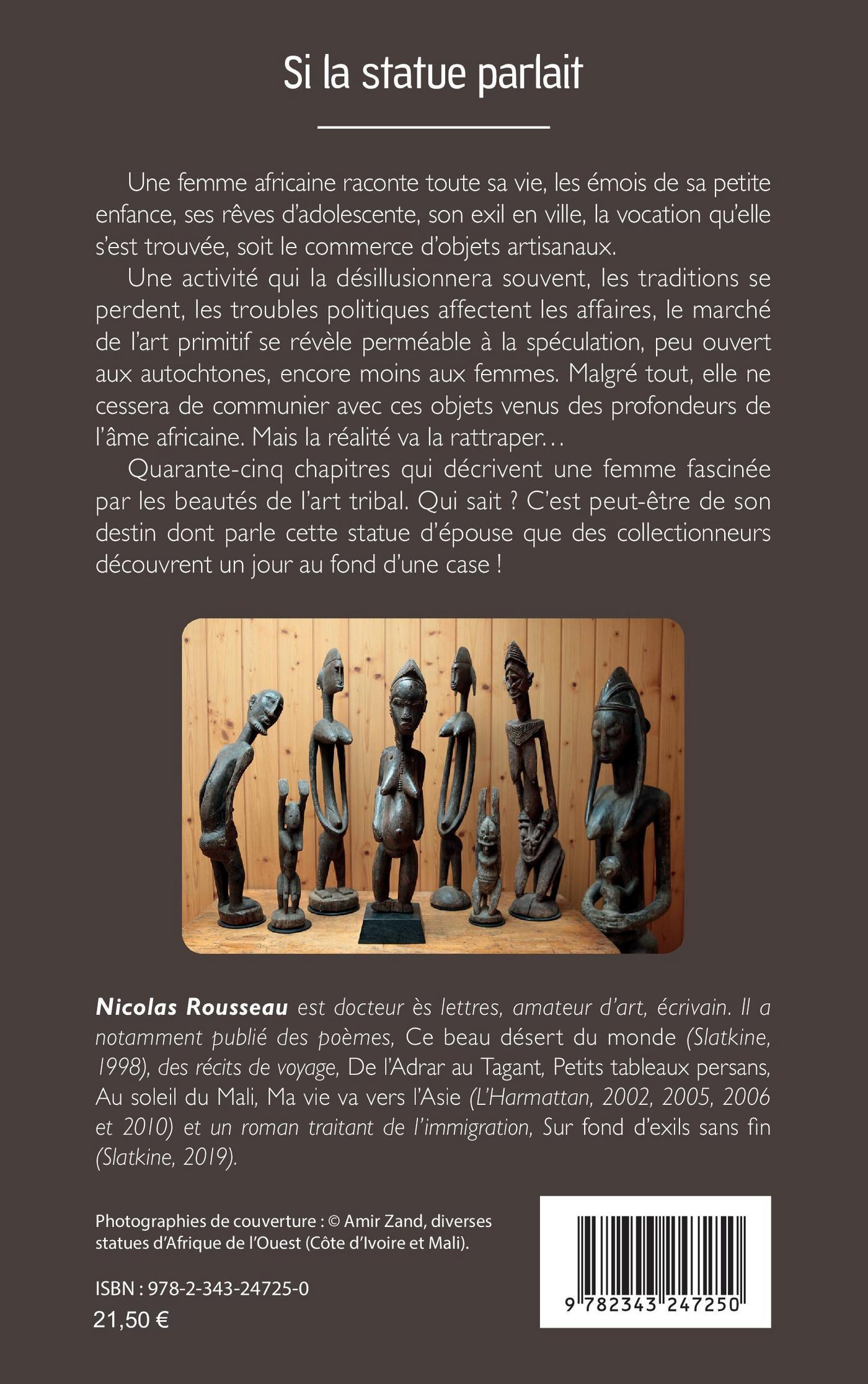 Une femme africaine raconte toute sa vie, les émois de sa petite enfance, ses rêves d’adolescente, son exil en ville, la vocation qu’elle s’est trouvée, soit le commerce d’objets artisanaux. Une activité qui la désillusionnera souvent, les traditions se perdent, les troubles politiques affectent les affaires, le marché de l’art primitif se révèle perméable à la spéculation, peu ouvert aux autochtones, encore moins aux femmes. Malgré tout, elle ne cessera de communier avec ces objets venus des profondeurs de l’âme africaine. Mais la réalité va la rattraper...Quarante-cinq chapitres qui décrivent une femme fascinée par les beautés de l’art tribal. Qui sait ? C’est peut-être de son destin dont parle cette statue d’épouse que des collectionneurs découvrent un jour au fond d’une case !