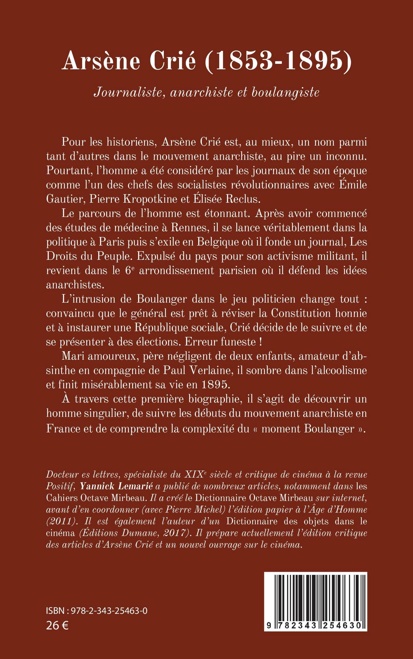 Pour les historiens, Arsène Crié est, au mieux, un nom parmi tant d'autres dans le mouvement anarchiste. Pourtant, l'homme a été considéré par les journaux de son époque comme l'un des chefs des socialistes révolutionnaires avec Émile Gautier, Pierre Kropotkine et Élisée Reclus. Après avoir commencé des études de médecine à Rennes, il se lance dans la politique à Paris puis s'exile en Belgique où il fonde un journal, Les Droits du Peuple. Expulsé pour activisme, il revient à Paris où il défend les idées anarchistes. L'intrusion de Boulanger dans le jeu politicien change tout : convaincu que le général est prêt à réviser la Constitution honnie et à instaurer une République sociale, Crié décide de le suivre et de se présenter à des élections. À travers cette première biographie, il s'agit de découvrir un homme singulier, de suivre les débuts du mouvement anarchiste en France et de comprendre la complexité du « moment Boulanger ».