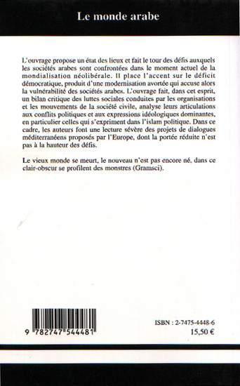 L'ouvrage propose un état des lieux et fait le tour des défis auxquels les sociétés arabes sont confrontées dans le moment actuel de la mondialisation néolibérale. Il place l'accent sur le déficit démocratique, produit d'une modernisation avortée qui accuse alors la vulnérabilité des sociétés arabes. L'ouvrage fait, dans cet esprit, un bilan critique des luttes sociales conduites par les organisations et les mouvements de la société civile, analyse leurs articulations aux conflits politiques et aux expressions idéologiques dominantes, en particulier celles qui s'expriment dans l'islam politique. Dans ce cadre, les auteurs font une lecture sévère des projets de dialogues méditérranéens proposés par l'Europe, dont la portée réduite n'est pas à la hauteur des défis.Le vieux monde se meurt, le nouveau n'est pas encore né, dans ce clair-obscur se profilent les monstres (Gramsci).