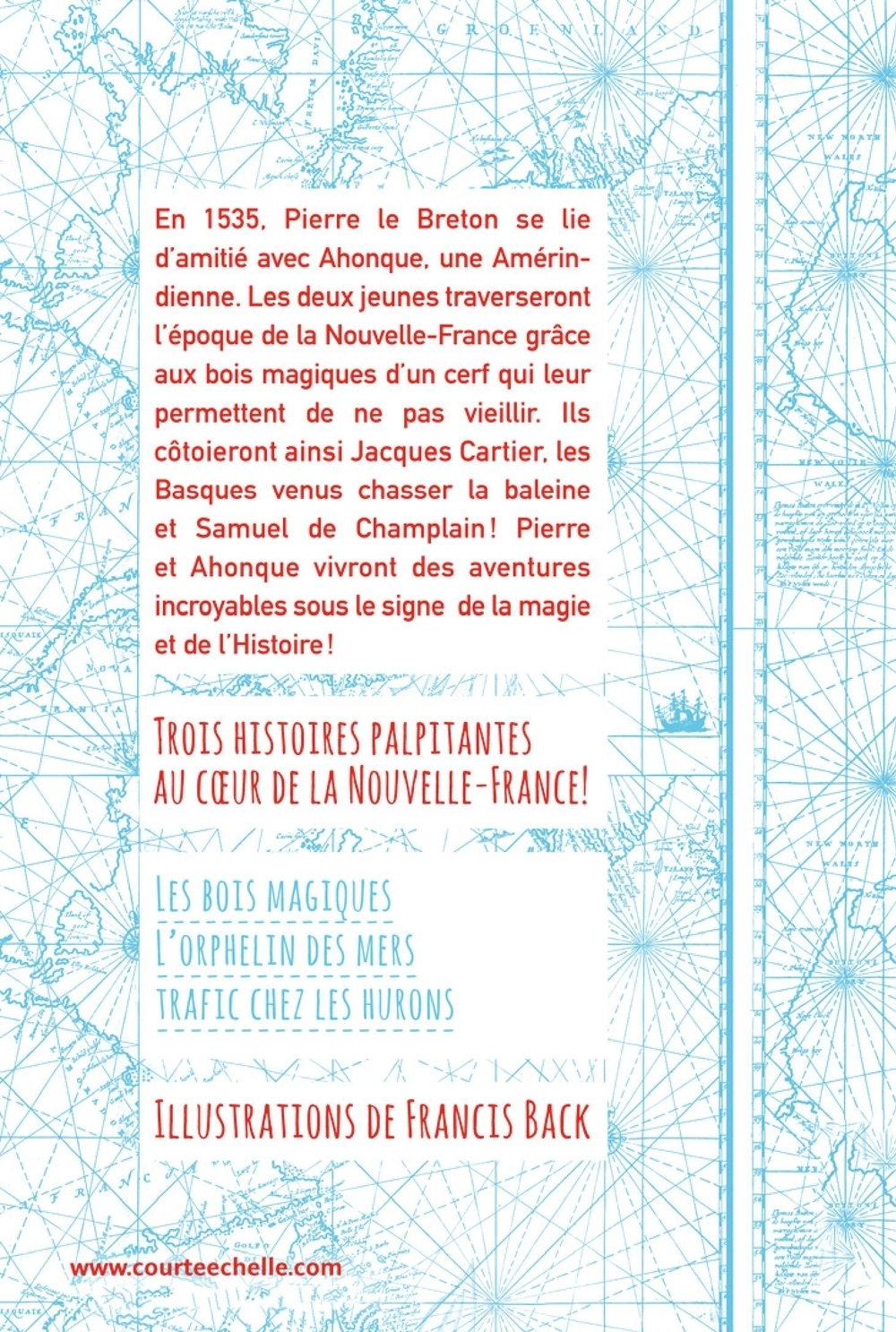 En 1535, Pierre le Breton se lie d'amitié avec Ahonque, une Amérindienne. Les deux jeunes traverseront l'époque de la Nouvelle-France grâce aux bois magiques d'un cerf qui leur permettent de ne pas vieillir. Ils côtoieront ainsi Jacques Cartier, les Basques venus chasser la baleine et Samuel de Champlain ! Pierre et Ahonque vivront des aventures incroyables sous le signe de la magie et de l'Histoire ! Trois histoires palpitantes au coeur de la Nouvelle- France ! Ce volume comprend Les bois magiques, L'orphelin des mers et Trafic chez les Hurons.