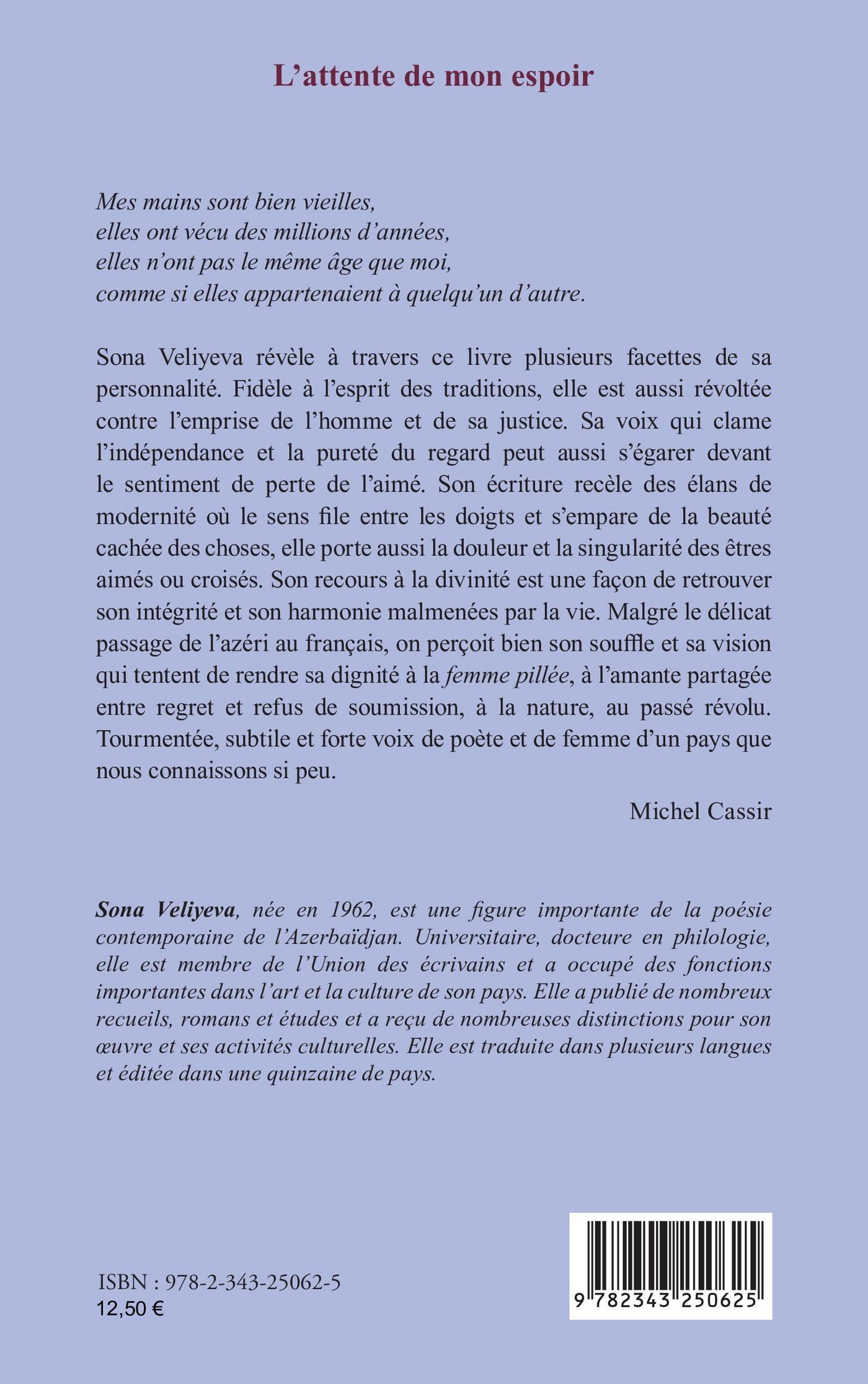 Mes mains sont bien vieilles,elles ont vécu des millions d’années,elles n’ont pas le même âge que moi,comme si elles appartenaient à quelqu’un d’autre.Sona Veliyeva révèle à travers ce livre plusieurs facettes de sa personnalité. Fidèle à l’esprit des traditions, elle est aussi révoltée contre l’emprise de l’homme et de sa justice. [...] Malgré le délicat passage de l’azéri au français, on perçoit bien son souffle et sa vision qui tentent de rendre sa dignité à la femme pillée, à l’amante partagée entre regret et refus de soumission, à la nature, au passé révolu. Tourmentée, subtile et forte voix de poète et de femme d’un pays que nous connaissons si peu. - Michel Cassir
