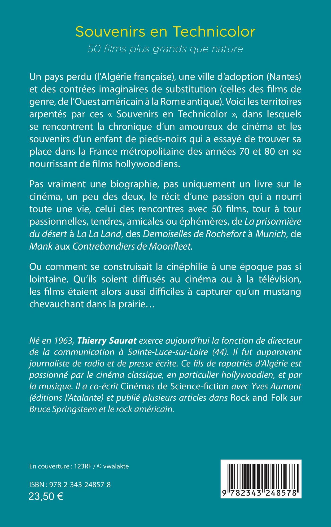Un pays perdu (l’Algérie française), une ville d’adoption (Nantes) et des contrées imaginaires de substitution (celles des films de genre, de l’Ouest américain à la Rome antique). Voici les territoires arpentés par ces « Souvenirs en Technicolor », dans lesquels se rencontrent la chronique d’un amoureux de cinéma et les souvenirs d’un enfant de pieds-noirs qui a essayé de trouver sa place dans la France métropolitaine des années 70 et 80 en se nourrissant de films hollywoodiens. Pas vraiment une biographie, pas uniquement un livre sur le cinéma, un peu des deux, le récit d’une passion qui a nourri toute une vie, celui des rencontres avec 50 films, tour à tour passionnelles, tendres, amicales ou éphémères, de La prisonnière du désert à La La Land, des Demoiselles de Rochefort à Munich, de Mank aux Contrebandiers de Moonfleet. Ou comment se construisait la cinéphilie à une époque pas si lointaine. Qu’ils soient diffusés au cinéma ou à la télévision, les films étaient alors aussi difficiles à capturer qu’un mustang chevauchant dans la prairie...