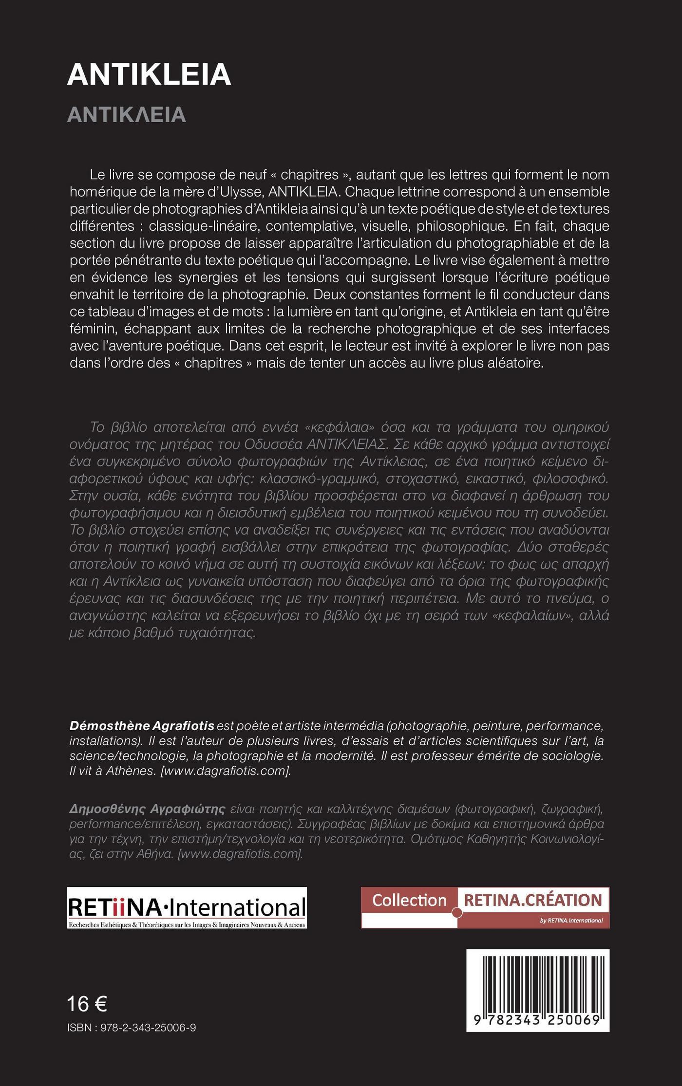 Cet ouvrage se compose de neuf chapitres, autant que les lettres du nom homérique de la mère d’Ulysse, ANTIKLEIA. Chaque lettrine correspond à un ensemble de photographies d’Antikleia ainsi qu’à un texte poétique de style et de textures différentes : classique-linéaire, contemplative, visuelle, philosophique. En fait, chaque section propose de laisser apparaître l’articulation du photographiable et de la portée pénétrante du texte poétique qui l’accompagne. Le livre vise aussi à mettre en évidence les synergies et les tensions qui surgissent lorsque l’écriture poétique envahit le territoire de la photographie. Deux constantes forment le fil conducteur : la lumière en tant qu’origine, et Antikleia en tant qu’être féminin, échappant aux limites de la recherche photographique et de ses interfaces avec l’aventure poétique.