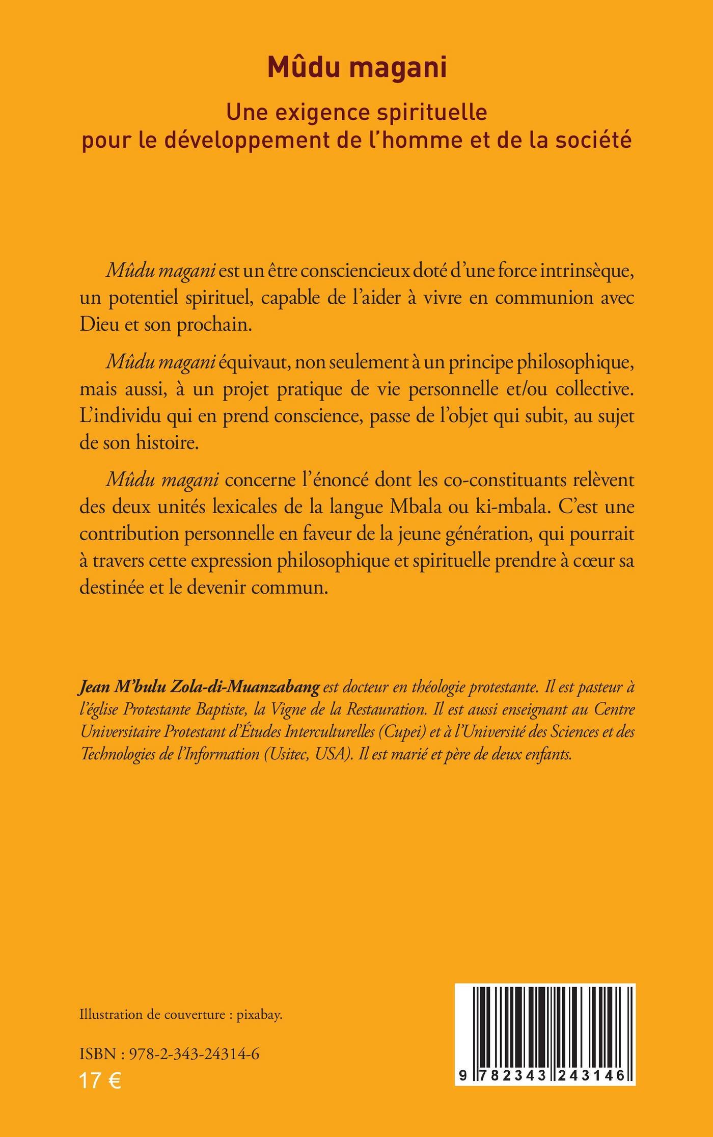 Mûdu magani est un être consciencieux doté d’une force intrinsèque, un potentiel spirituel, capable de l’aider à vivre en communion avec Dieu et son prochain. Mûdu magani équivaut, non seulement à un principe philosophique, mais aussi, à un projet pratique de vie personnelle et/ou collective. L’individu qui en prend conscience, passe de l’objet qui subit, au sujet de son histoire. Mûdu magani concerne l’énoncé dont les co-constituants relèvent des deux unités lexicales de la langue Mbala ou ki-mbala. C’est une contribution personnelle en faveur de la jeune génération, qui pourrait à travers cette expression philosophique et spirituelle prendre à coeur sa destinée et le devenir commun.