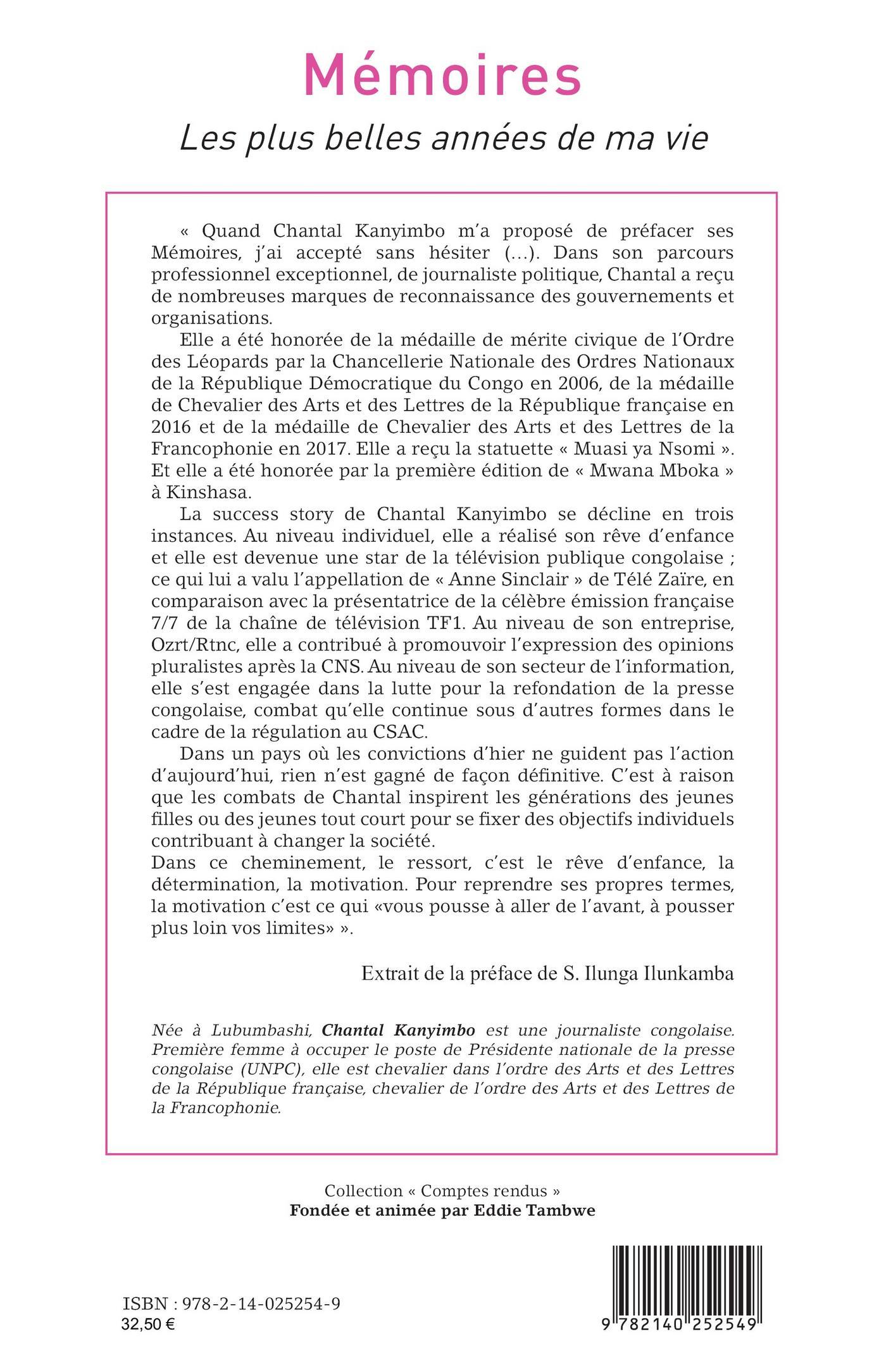 « Dans son parcours professionnel exceptionnel, de journaliste politique, Chantal a reçu de nombreuses marques de reconnaissance des gouvernements et organisations. Sa success story se décline en trois instances. Au niveau individuel, elle a réalisé son rêve d’enfance et elle est devenue une star de la télévision publique congolaise ; ce qui lui a valu l’appellation de « Anne Sinclair » de Télé Zaïre. Au niveau de son entreprise, Ozrt/Rtnc, elle a contribué à promouvoir l’expression des opinions pluralistes après la CNS. Au niveau de son secteur de l’information, elle s’est engagée dans la lutte pour la refondation de la presse congolaise, combat qu’elle continue sous d’autres formes dans le cadre de la régulation au CSAC. C’est à raison que les combats de Chantal inspirent les générations des jeunes filles ou des jeunes tout court pour se fixer des objectifs individuels contribuant à changer la société ».