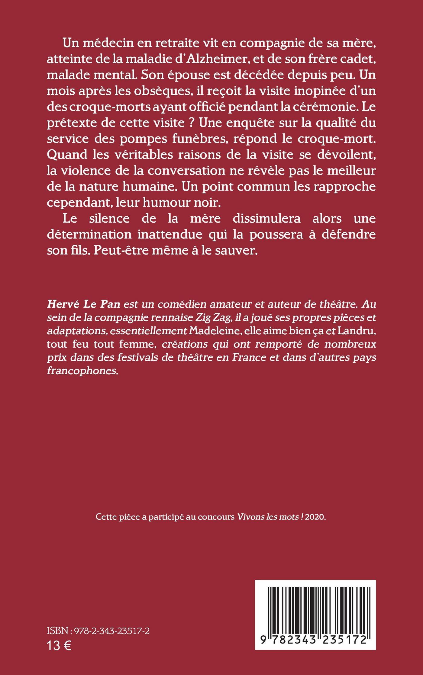 Un médecin en retraite vit en compagnie de sa mère, atteinte de la maladie d’Alzheimer, et de son frère cadet, malade mental. Son épouse est décédée depuis peu. Un mois après les obsèques, il reçoit la visite inopinée d’un des croque-morts ayant officié pendant la cérémonie. Le prétexte de cette visite ? Une enquête sur la qualité du service des pompes funèbres, répond le croque-mort. Quand les véritables raisons de la visite se dévoilent, la violence de la conversation ne révèle pas le meilleur de la nature humaine. Un point commun les rapproche cependant, leur humour noir. Le silence de la mère dissimulera alors une détermination inattendue qui la poussera à défendre son fils. Peut-être même à le sauver.