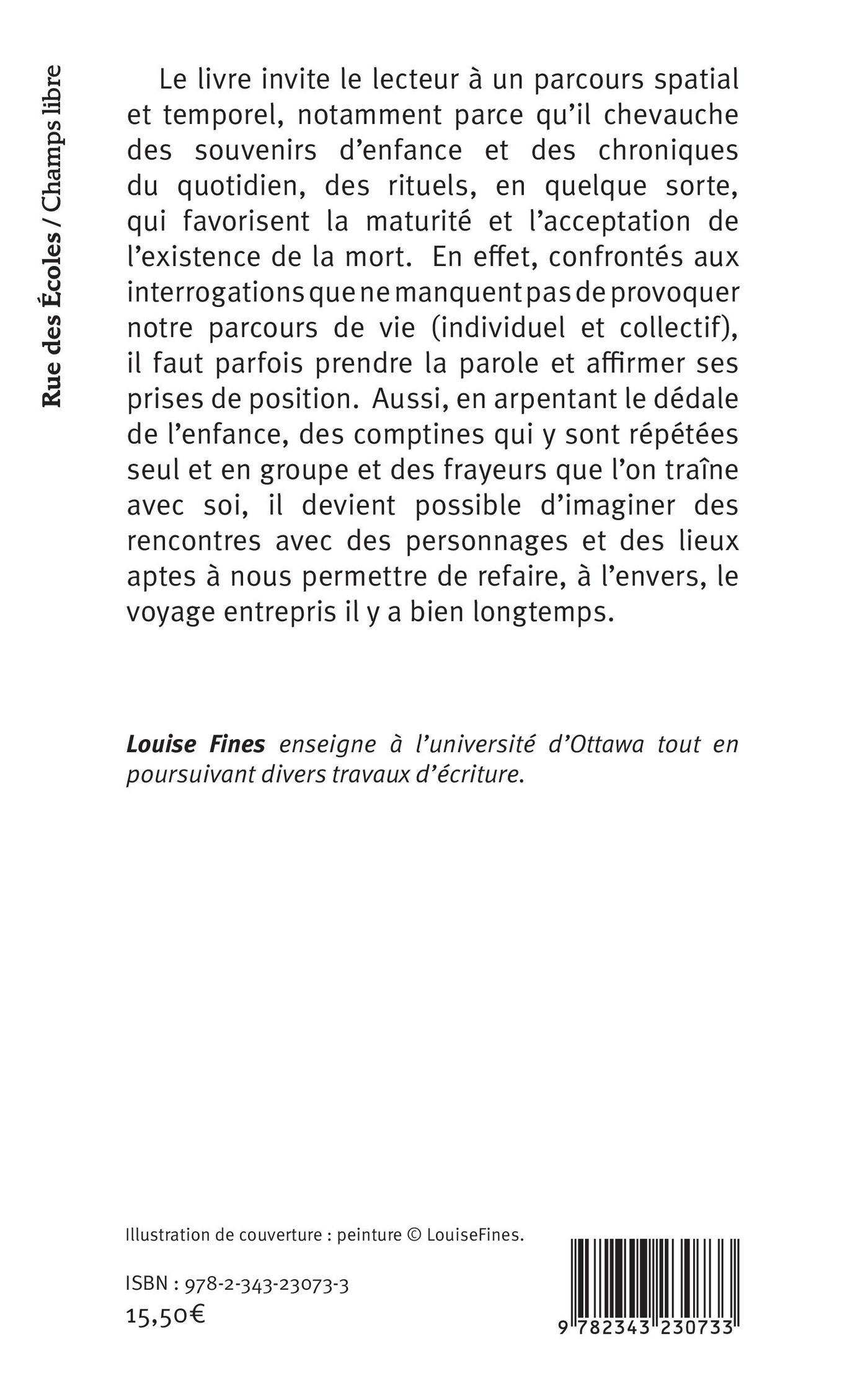 Le livre invite le lecteur à un parcours spatial et temporel, notamment parce qu'il chevauche des souvenirs d'enfance et des chroniques du quotidien, des rituels, en quelque sorte, qui favorisent la maturité et l'acceptation de l'existence de la mort. En effet, confrontés aux interrogations que ne manquent pas de provoquer notre parcours de vie (individuel et collectif ), il faut parfois prendre la parole et affirmer ses prises de position. Aussi, en arpentant le dédale de l'enfance, des comptines qui y sont répétées seul et en groupe et des frayeurs que l'on traîne avec soi, il devient possible d'imaginer des rencontres avec des personnages et des lieux aptes à nous permettre de refaire, à l'envers, le voyage entrepris il y a bien longtemps.