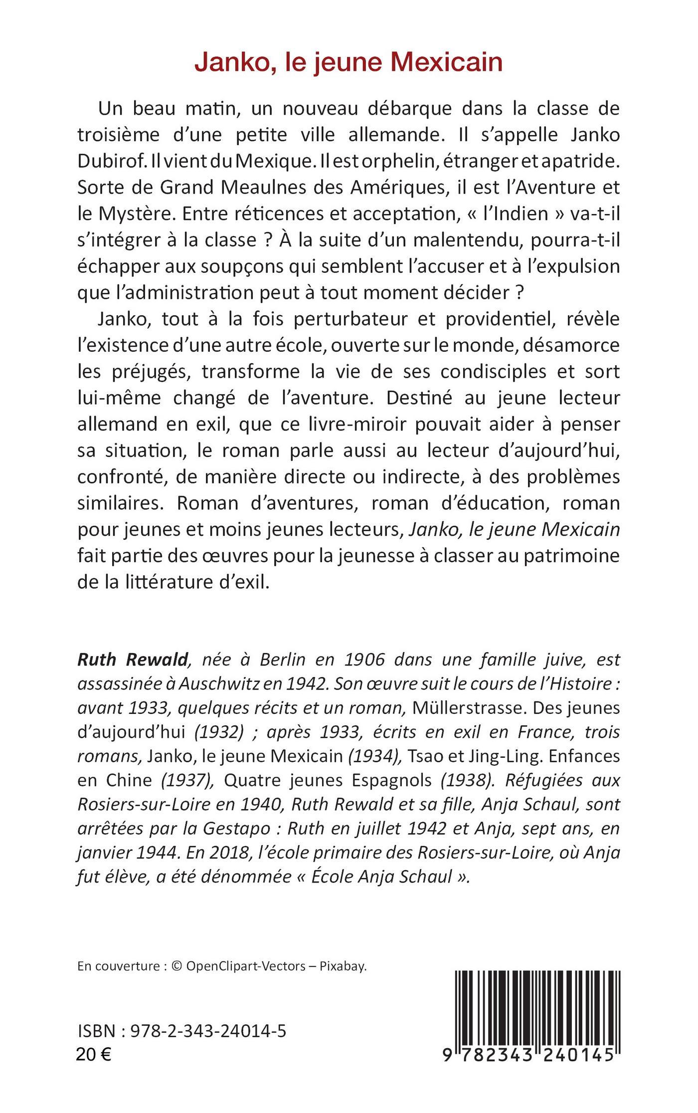 Un beau matin, un nouveau débarque dans la classe de troisième d’une petite ville allemande. Il s’appelle Janko Dubirof. Il vient du Mexique. Il est orphelin, étranger et apatride. Sorte de Grand Meaulnes des Amériques, il est l’Aventure et le Mystère. Entre réticences et acceptation, « l’Indien » va-t-il s’intégrer à la classe ? À la suite d’un malentendu, pourra-t-il échapper aux soupçons qui semblent l’accuser et à l’expulsion que l’administrati on peut à tout moment décider ? Janko, tout à la fois perturbateur et providentiel, révèle l’existence d’une autre école, ouverte sur le monde, désamorce les préjugés, transforme la vie de ses condisciples et sort lui-même changé de l’aventure. Roman d’aventures, roman d’éducation, roman pour jeunes et moins jeunes lecteurs, Janko, le jeune Mexicain fait partie des oeuvres pour la jeunesse à classer au patrimoine de la littérature d’exil.