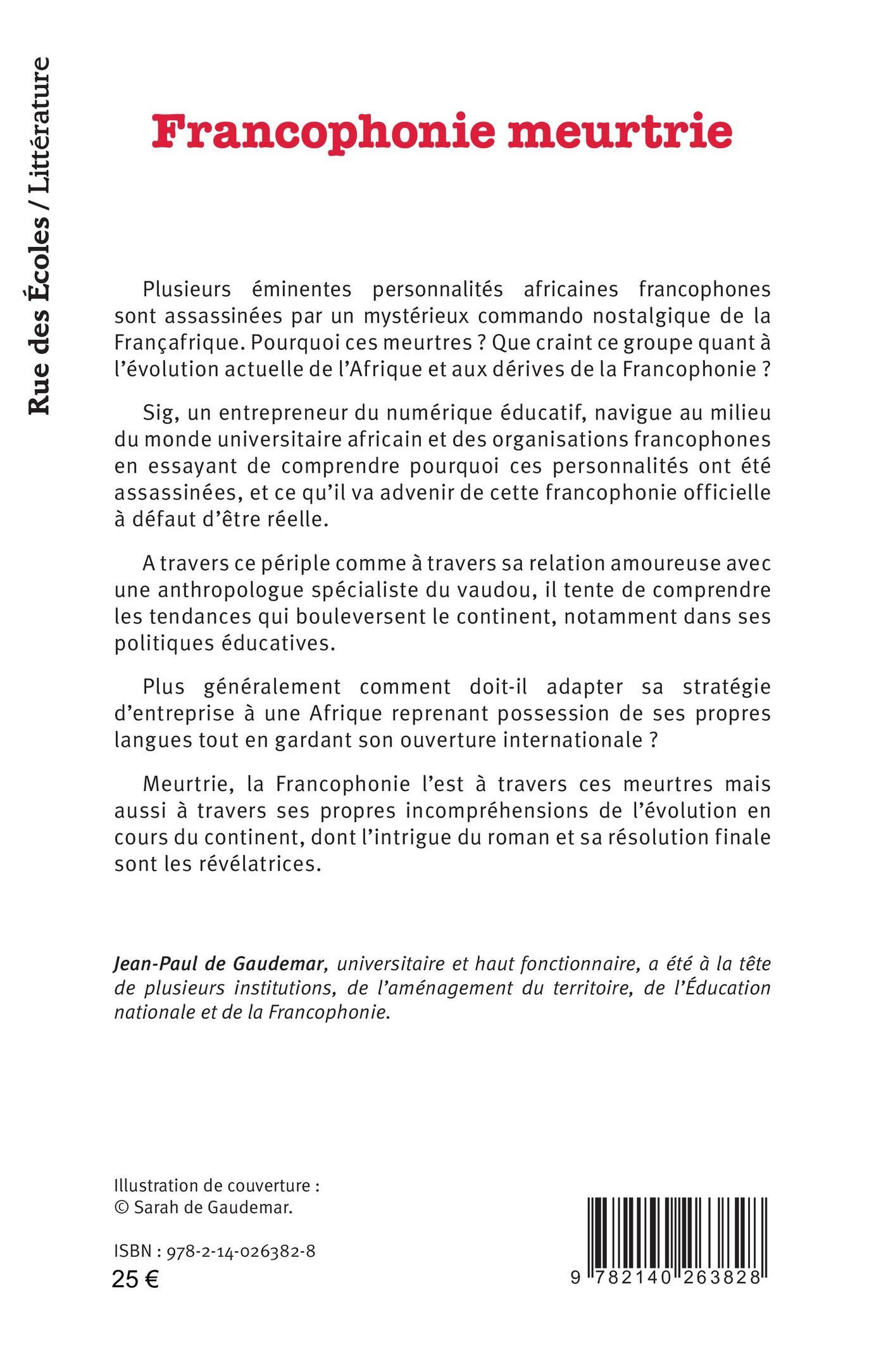 Plusieurs éminentes personnalités africaines francophones sont assassinées par un mystérieux commando nostalgique de la Françafrique. Pourquoi ces meurtres ? Que craint ce groupe quant à l’évolution actuelle de l’Afrique et aux dérives de la Francophonie ? Sig, un entrepreneur du numérique éducatif, navigue au milieu du monde universitaire africain et des organisations francophones en essayant de comprendre pourquoi ces personnalités ont été assassinées, et ce qu’il va advenir de cette francophonie officielle à défaut d’être réelle. A travers ce périple comme à travers sa relation amoureuse avec une anthropologue spécialiste du vaudou, il tente de comprendre les tendances qui bouleversent le continent, notamment dans ses politiques éducatives. Plus généralement comment doit-il adapter sa stratégie d’entreprise à une Afrique reprenant possession de ses propres langues tout en gardant son ouverture internationale ? Meurtrie, la Francophonie l’est à travers ces meurtres mais aussi à travers ses propres incompréhensions de l’évolution en cours du continent, dont l’intrigue du roman et sa résolution finale sont les révélatrices.