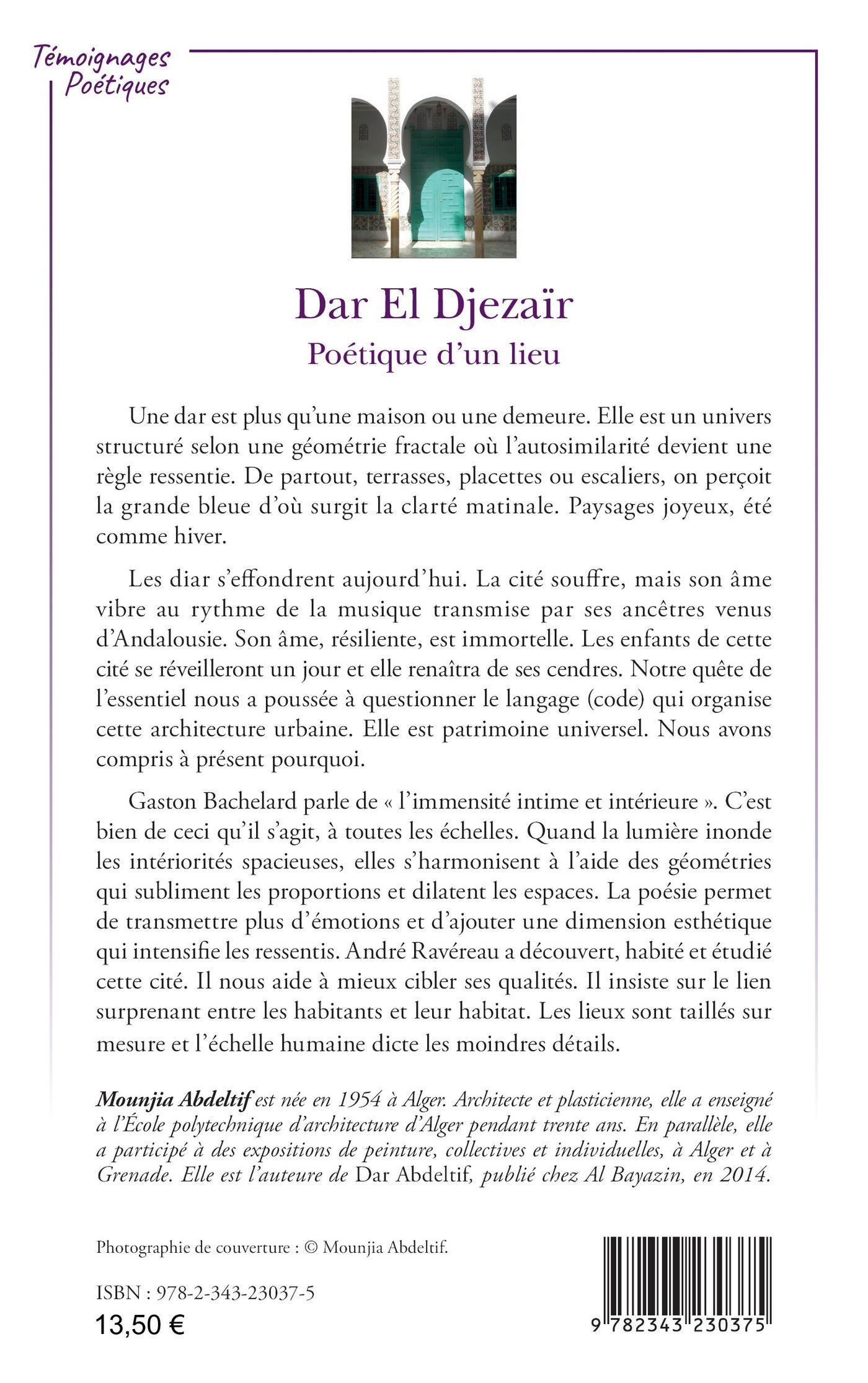 Une dar est plus qu’une maison ou une demeure. Elle est un univers structuré selon une géométrie fractale où l’autosimilarité devient une règle ressentie. De partout, terrasses, placettes ou escaliers, on perçoit la grande bleue d’où surgit la clarté matinale. Paysages joyeux, été comme hiver. Les diar s’effondrent aujourd’hui. La cité souffre, mais son âme vibre au rythme de la musique transmise par ses ancêtres venus d’Andalousie. Son âme, résiliente, est immortelle. Les enfants de cette cité se réveilleront un jour et elle renaîtra de ses cendres. Notre quête de l’essentiel nous a poussée à questionner le langage (code) qui organise cette architecture urbaine. Elle est patrimoine universel. Nous avons compris à présent pourquoi.