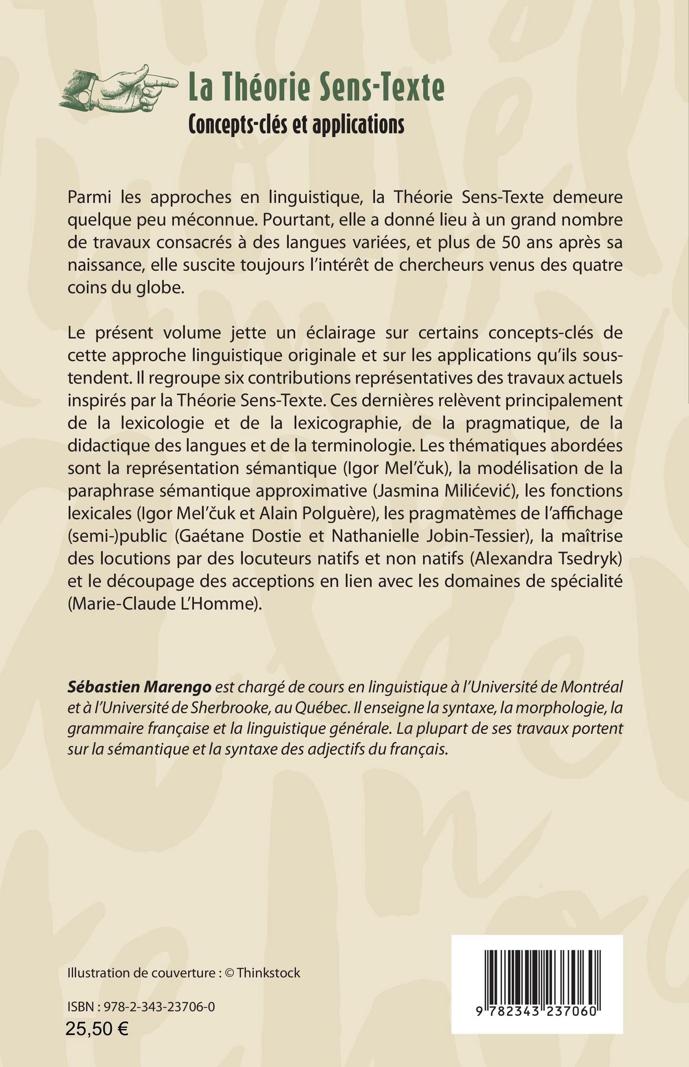 Parmi les approches en linguistique, la Théorie Sens-Texte demeure quelque peu méconnue. Pourtant, elle a donné lieu à un grand nombre de travaux consacrés à des langues variées, et plus de 50 ans après sa naissance, elle suscite toujours l’intérêt de chercheurs venus des quatre coins du globe. Le présent volume jette un éclairage sur certains concepts-clés de cette approche linguistique originale et sur les applications qu’ils sous-tendent. Il regroupe six contributions représentatives des travaux actuels inspirés par la Théorie Sens-Texte. Ces dernières relèvent principalement de la lexicologie et de la lexicographie, de la pragmatique, de la didactique des langues et de la terminologie. Les thématiques abordées sont la représentation sémantique (Igor Mel’cuk), la modélisation de laparaphrase sémantique approximative (Jasmina Milicevic), les fonctions lexicales (Igor Mel’cuk et Alain Polguère), les pragmatèmes de l’affichage (semi-)public (Gaétane Dostie et Nathanielle Jobin-Tessier), la maîtrise des locutions par des locuteurs natifs et non natifs (Alexandra Tsedryk) et le découpage des acceptions en lien avec les domaines de spécialité (Marie-Claude L’Homme).