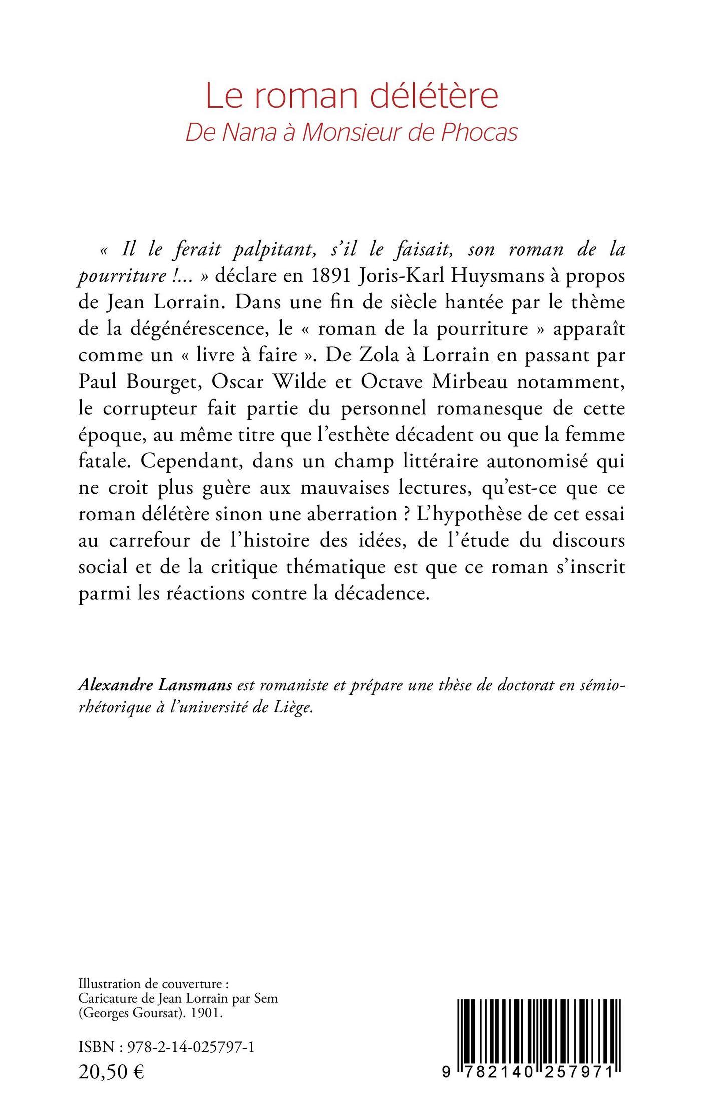 « Il le ferait palpitant, s' il le faisait, son roman de la pourriture !... » déclare en 1891 Joris-Karl Huysmans à proposde Jean Lorrain. Dans une fin de siècle hantée par le thèmede la dégénérescence, le « roman de la pourriture » apparaîtcomme un « livre à faire ». De Zola à Lorrain en passant par Paul Bourget, Oscar Wilde et Octave Mirbeau notamment,le corrupteur fait partie du personnel romanesque de cette époque, au même titre que l'esthète décadent ou que la femme fatale. Cependant, dans un champ littéraire autonomisé qui ne croit plus guère aux mauvaises lectures, qu'est-ce que ce roman délétère sinon une aberration ? L'hypothèse de cet essai au carrefour de l'histoire des idées, de l'étude du discours social et de la critique thématique est que ce roman s'inscrit parmi les réactions contre la décadence.