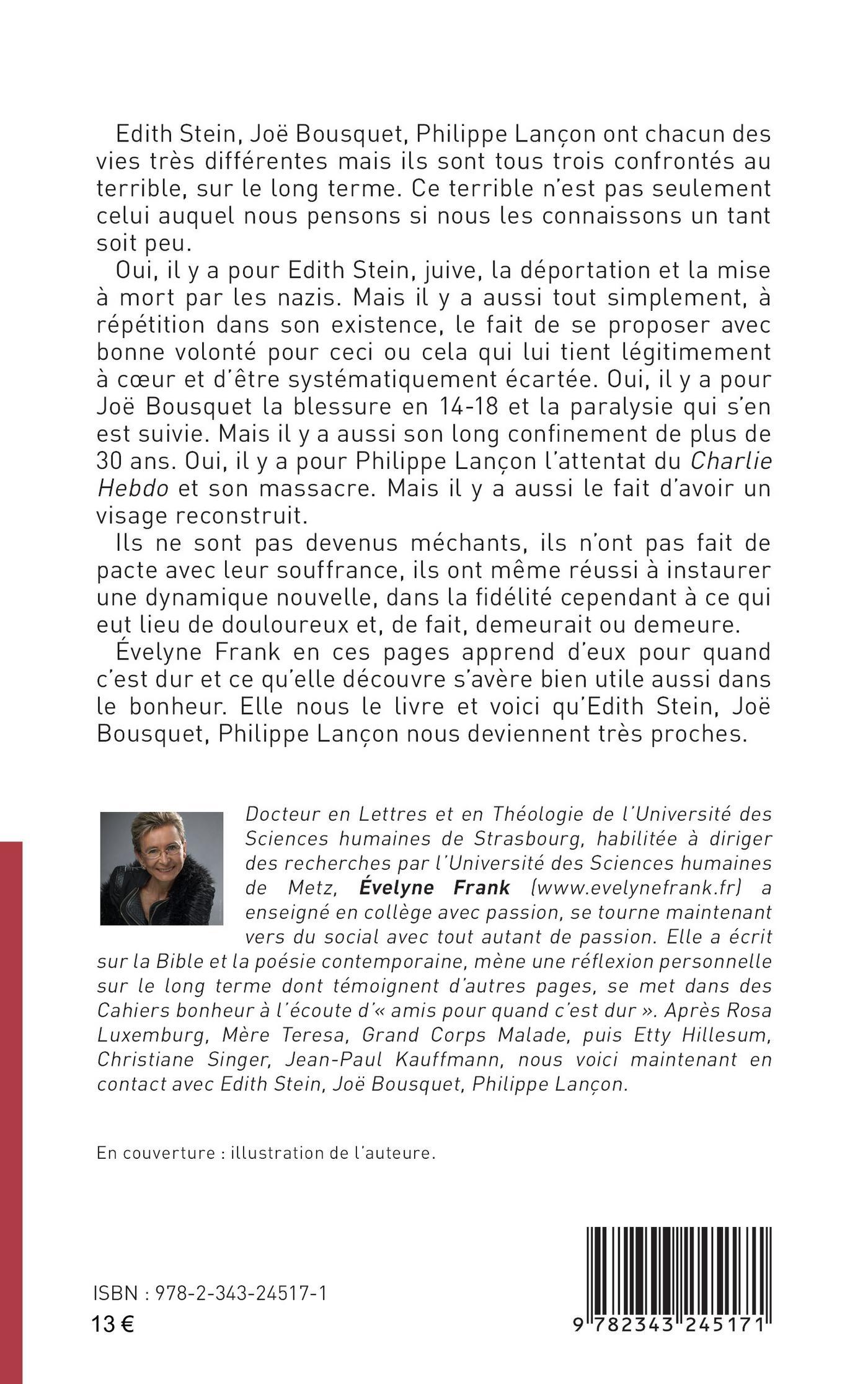 Edith Stein, Joë Bousquet, Philippe Lançon ont chacun des vies très différentes mais ils sont tous trois confrontés au terrible, sur le long terme. Ce terrible n’est pas seulement celui auquel nous pensons si nous les connaissons un tant soit peu. Oui, il y a pour Edith Stein, juive, la déportation et la mise à mort par les nazis. Mais il y a aussi tout simplement, à répétition dans son existence, le fait de se proposer avec bonne volonté pour ceci ou cela qui lui tient légitimement à coeur et d’être systématiquement écartée. Oui, il y a pour Joë Bousquet la blessure en 14-18 et la paralysie qui s’en est suivie. Mais il y a aussi son long confinement de plus de 30 ans. Oui, il y a pour Philippe Lançon l’attentat du Charlie Hebdo et son massacre. Mais il y a aussi le fait d’avoir un visage reconstruit. Ils ne sont pas devenus méchants, ils n’ont pas fait de pacte avec leur souffrance, ils ont même réussi à instaurer une dynamique nouvelle, dans la fidélité cependant à ce qui eut lieu de douloureux et, de fait, demeurait ou demeure. Évelyne Frank en ces pages apprend d’eux pour quand c’est dur et ce qu’elle découvre s’avère bien utile aussi dans le bonheur. Elle nous le livre et voici qu’Edith Stein, Joë Bousquet, Philippe Lançon nous deviennent très proches.