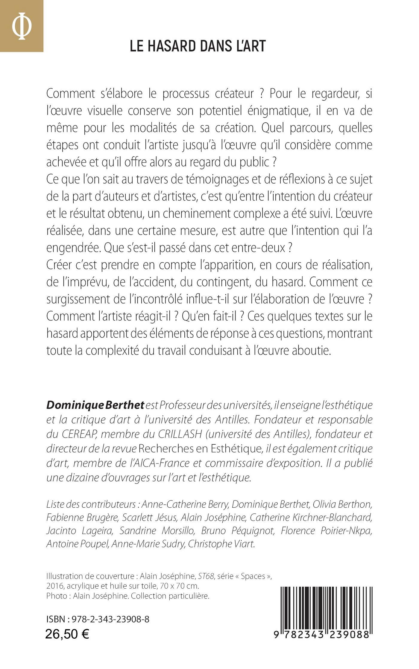 Comment s’élabore le processus créateur ? Pour le regardeur, si l’oeuvre visuelle conserve son potentiel énigmatique, il en va de même pour les modalités de sa création. Quel parcours, quelles étapes ont conduit l’artiste jusqu’à l’oeuvre qu’il considère comme achevée et qu’il offre alors au regard du public ? Ce que l’on sait au travers de témoignages et de réflexions à ce sujet de la part d’auteurs et d’artistes, c’est qu’entre l’intention du créateur et le résultat obtenu, un cheminement complexe a été suivi. L’oeuvre réalisée, dans une certaine mesure, est autre que l’intention qui l’a engendrée. Que s’est-il passé dans cet entre-deux ? Créer c’est prendre en compte l’apparition, en cours de réalisation, de l’imprévu, de l’accident, du contingent, du hasard. Comment ce surgissement de l’incontrôlé influe-t-il sur l’élaboration de l’oeuvre ? Comment l’artiste réagit-il ? Qu’en fait-il ? Ces quelques textes sur le hasard apportent des éléments de réponse à ces questions, montrant toute la complexité du travail conduisant à l’oeuvre aboutie.