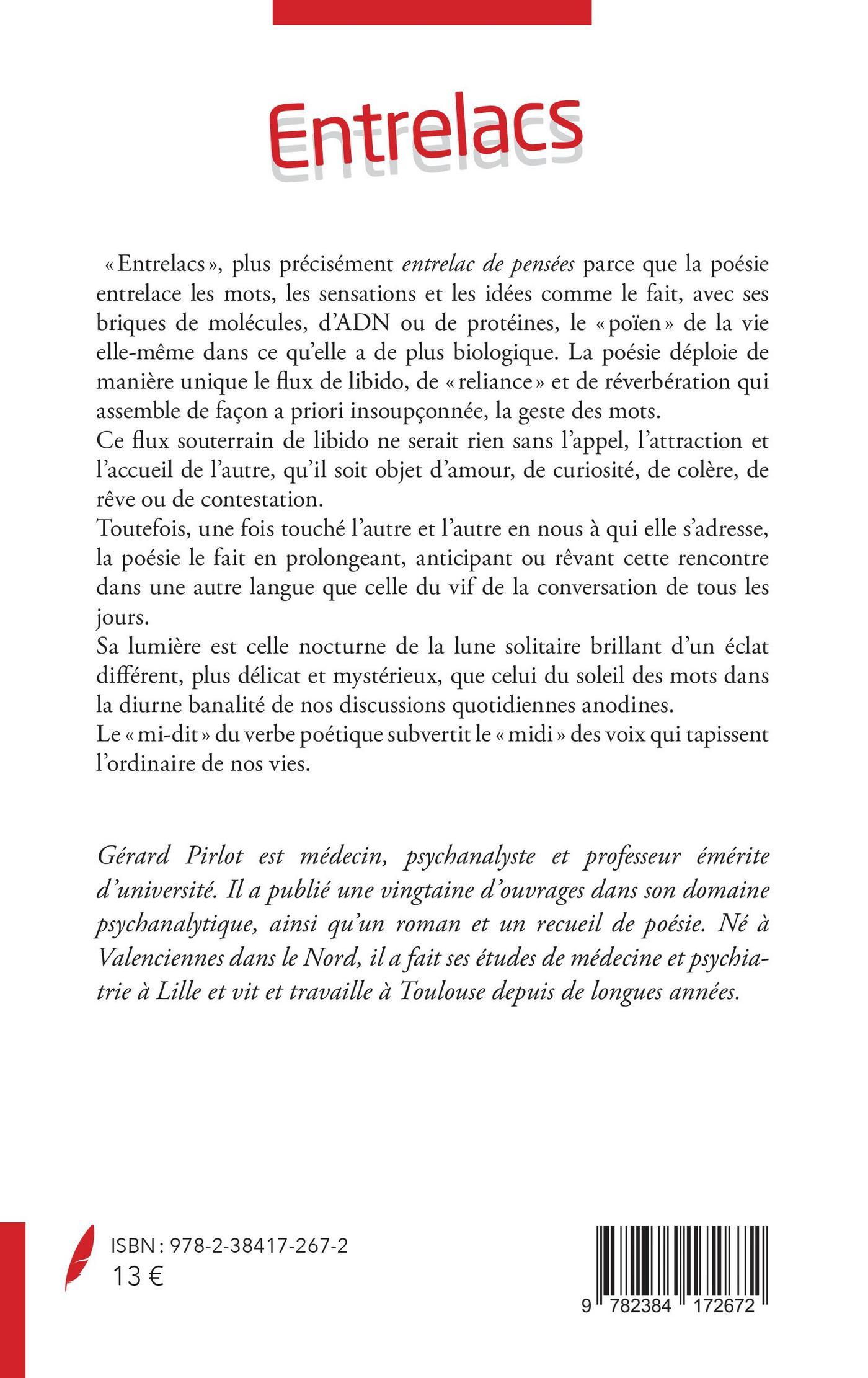 «Entrelacs», plus précisément entrelac de pensées parce que la poésie entrelace les mots, les sensations et les idées comme le fait, avec ses briques de molécules, d'ADN ou de protéines, le «poïen» de la vie elle-même dans ce qu'elle a de plus biologique. La poésie déploie de manière unique le flux de libido, de «reliance» et de réverbération qui assemble de façon a priori insoupçonnée, la geste des mots. Ce flux souterrain de libido ne serait rien sans l'appel, l'attraction et 'accueil de l'autre, qu'il soit objet d'amour, de curiosité, de colère, de rêve ou de contestation. Toutefois, une fois touché l'autre et l'autre en nous à qui elle s'adresse, la poésie le fait en prolongeant, anticipant ou rêvant cette rencontre dans une autre langue que celle du vif de la conversation de tous les jours. Sa lumière est celle nocturne de la lune solitaire brillant d'un éclat différent, plus délicat et mystérieux, que celui du soleil des mots dans la diurne banalité de nos discussions quotidiennes anodines. Le «mi-dit» du verbe poétique subvertit le «midi» des voix qui tapissent l'ordinaire de nos vies.