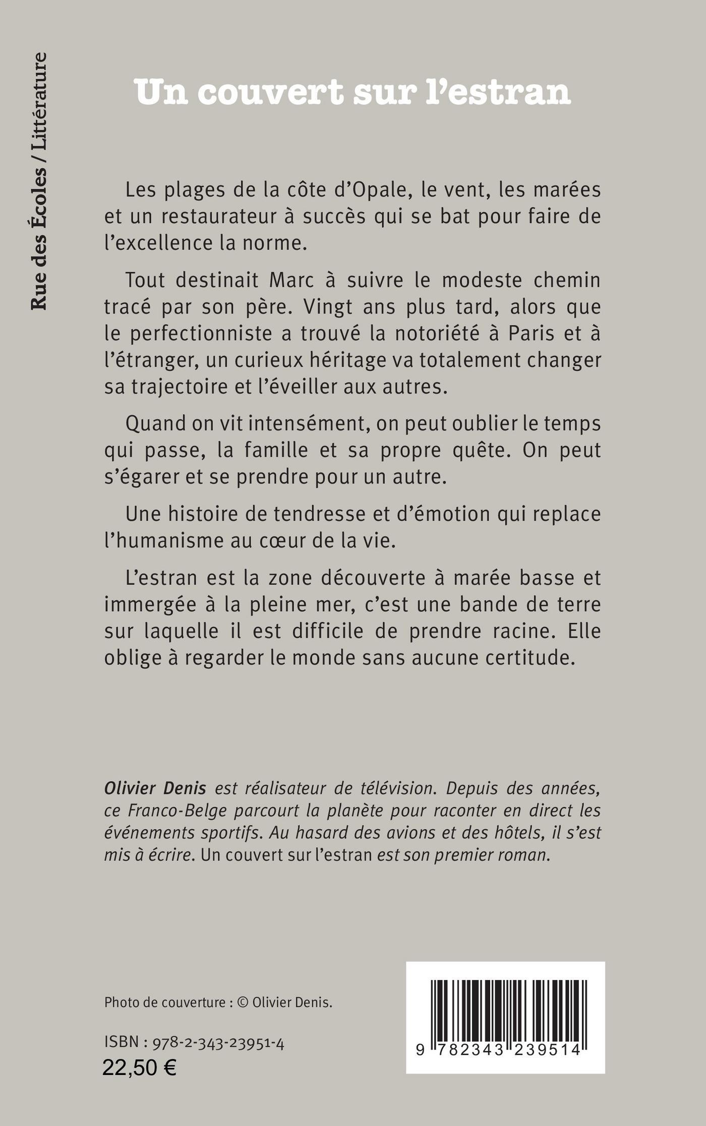 Les plages de la côte d’Opale, le vent, les marées et un restaurateur à succès qui se bat pour faire de l’excellence la norme.Tout destinait Marc à suivre le modeste chemin tracé par son père. Vingt ans plus tard, alors que le perfectionniste a trouvé la notoriété à Paris et à l’étranger, un curieux héritage va totalement changer sa trajectoire et l’éveiller aux autres. Quand on vit intensément, on peut oublier le temps qui passe, la famille et sa propre quête. On peut s’égarer et se prendre pour un autre. Une histoire de tendresse et d’émotion qui replace l’humanisme au coeur de la vie. L’estran est la zone découverte à marée basse et immergée à la pleine mer, c’est une bande de terre sur laquelle il est difficile de prendre racine. Elle oblige à regarder le monde sans aucune certitude.