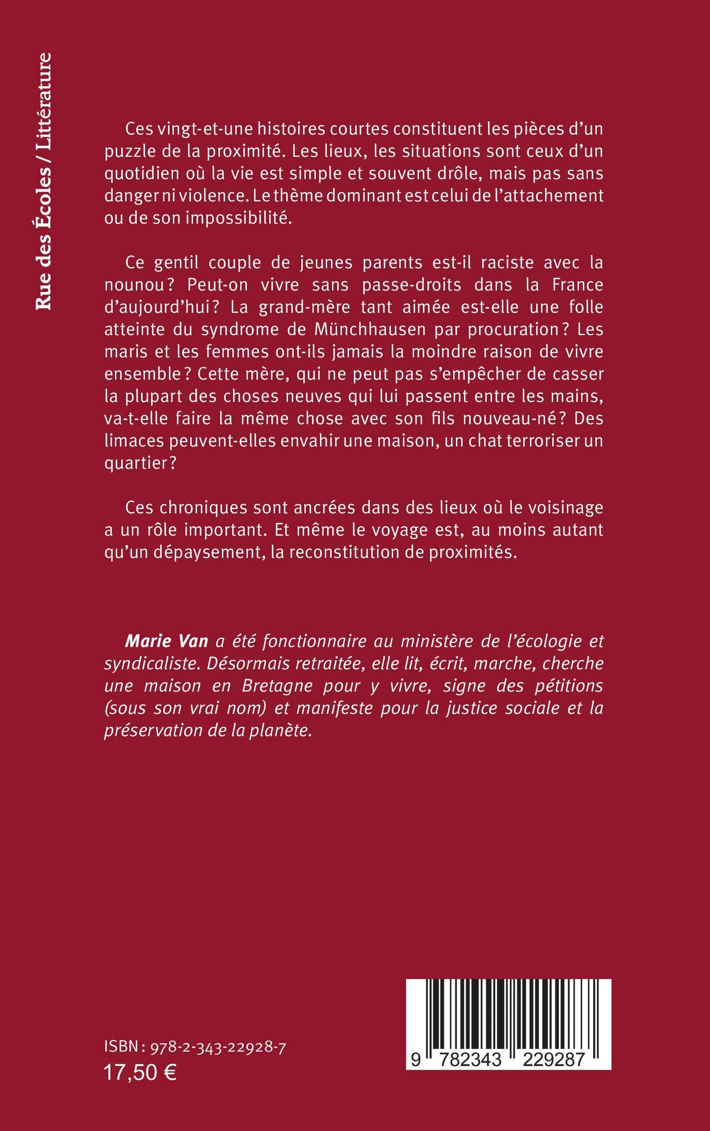 Ces vingt-et-une histoires courtes constituent les pièces d’un puzzle de la proximité. Les lieux, les situations sont ceux d’un quotidien où la vie est simple et souvent drôle, mais pas sans danger ni violence. Le thème dominant est celui de l’attachement ou de son impossibilité. Ce gentil couple de jeunes parents est-il raciste avec la nounou ? Peut-on vivre sans passe-droits dans la France d’aujourd’hui ? La grand-mère tant aimée est-elle une folle atteinte du syndrome de Münchhausen par procuration? Les maris et les femmes ont-ils jamais la moindre raison de vivre ensemble ? Cette mère, qui ne peut pas s’empêcher de casser la plupart des choses neuves qui lui passent entre les mains, va-t-elle faire la même chose avec son fils nouveau-né ? Des limaces peuvent-elles envahir une maison, un chat terroriser un quartier ?