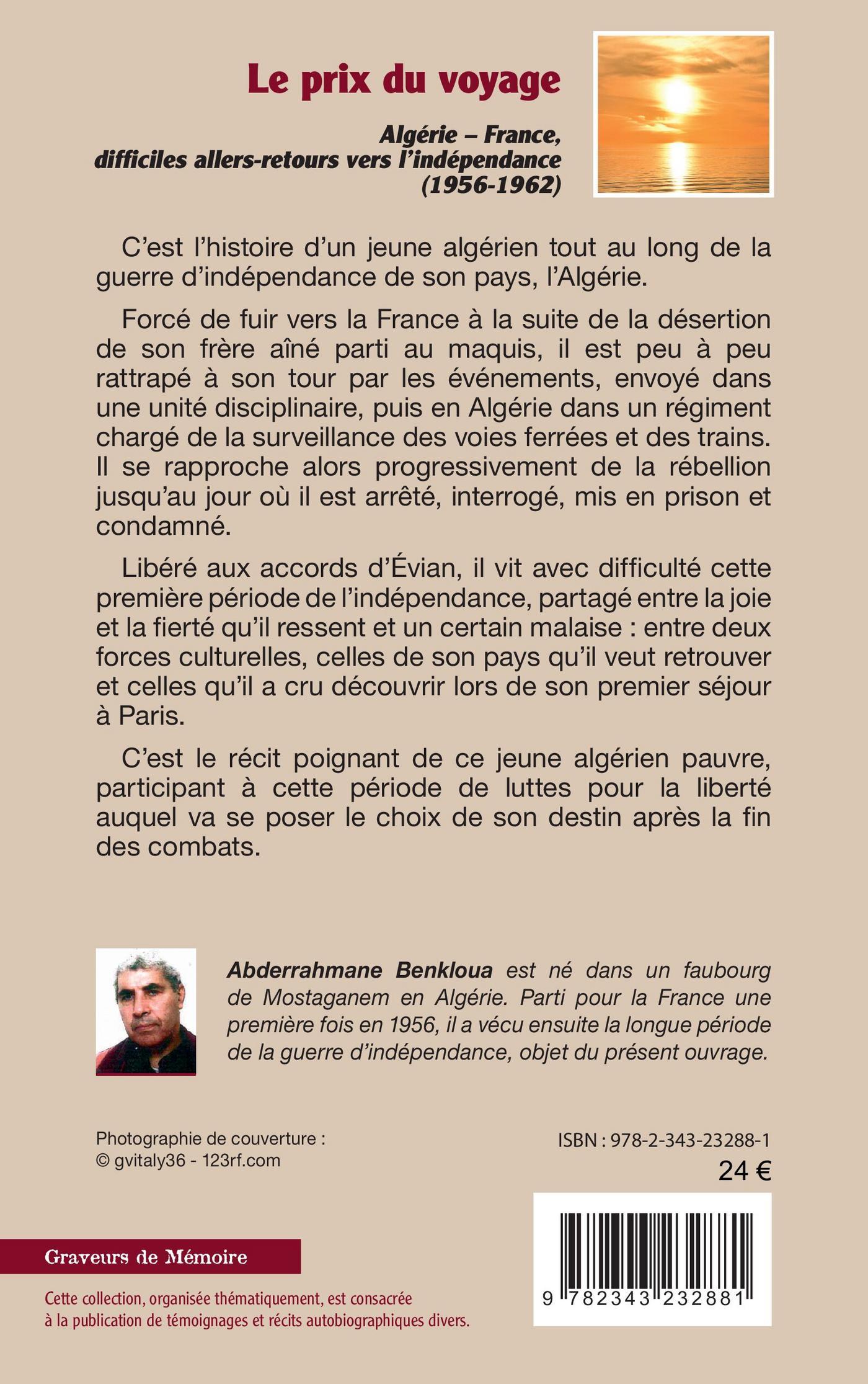 Ce livre fait suite à un premier ouvrage Mostaganem, dure enfance en Algérie. Forcé de fuir vers la France à la suite de la désertion de l'armée française de son frère aîné parti au maquis, il est peu à peu rattrapé à son tour par les événements, envoyé dans une unité disciplinaire, puis en Algérie dans un régiment chargé de la surveillance des voies ferrées et des trains. Il se rapproche alors progressivement de la rébellion jusqu’au jour où il est mis en prison et condamné. Libéré aux accords d’Évian, il vit avec difficulté cette première période de l’indépendance, partagé entre deux forces culturelles, celles de son pays qu’il veut retrouver et celles qu’il a cru découvrir lors de son premier séjour à Paris.