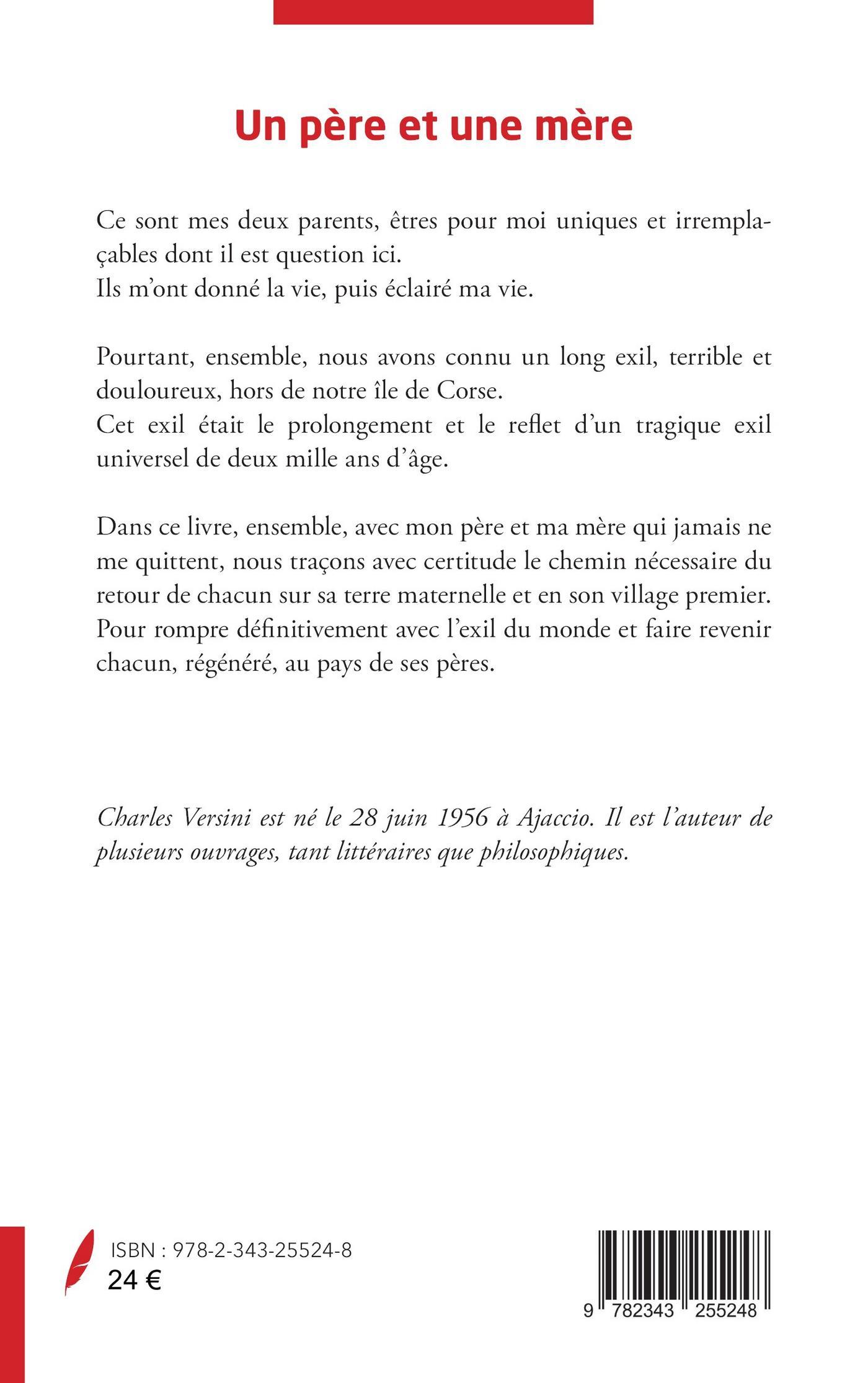 Ce sont mes deux parents, êtres pour moi uniques et irremplaçables dont il est question ici. Ils m’ont donné la vie, puis éclairé ma vie. Pourtant, ensemble, nous avons connu un long exil, terrible et douloureux, hors de notre île de Corse. Cet exil était le prolongement et le reflet d’un tragique exil universel de deux mille ans d’âge. Dans ce livre, ensemble, avec mon père et ma mère qui jamais ne me quittent, nous traçons avec certitude le chemin nécessaire du retour de chacun sur sa terre maternelle et en son village premier. Pour rompre définitivement avec l’exil du monde et faire revenir chacun, régénéré, au pays de ses pères.