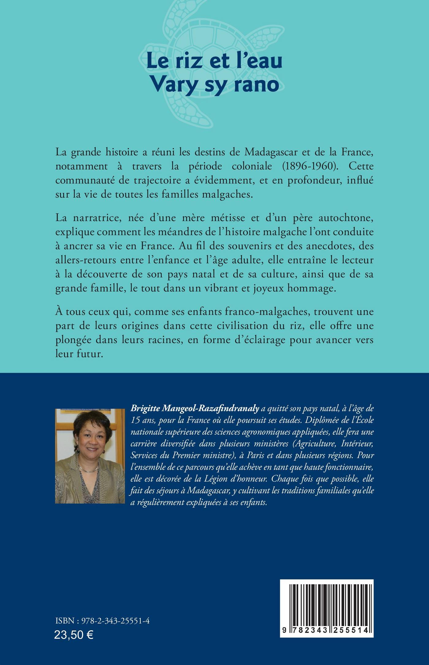 La grande histoire a réuni les destins de Madagascar et de la France, notamment à travers la période coloniale (1896-1960). Cette communauté de trajectoire a évidemment, et en profondeur, influé sur la vie de toutes les familles malgaches.La narratrice, née d’une mère métisse et d’un père autochtone, explique comment les méandres de l’histoire malgache l’ont conduite à ancrer sa vie en France. Au fil des souvenirs et des anecdotes, des allers-retours entre l’enfance et l’âge adulte, elle entraîne le lecteur à la découverte de son pays natal et de sa culture, ainsi que de sa grande famille, le tout dans un vibrant et joyeux hommage.À tous ceux qui, comme ses enfants franco-malgaches, trouvent une part de leurs origines dans cette civilisation du riz, elle offre une plongée dans leurs racines, en forme d’éclairage pour avancer vers leur futur.