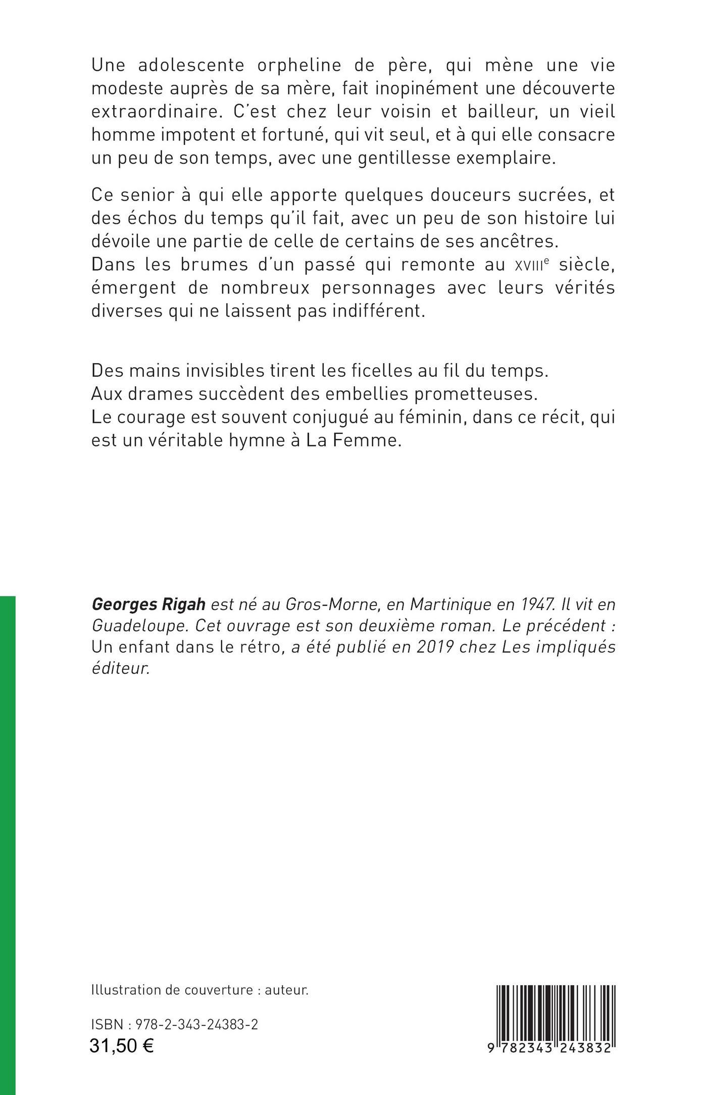 Une adolescente orpheline de père, qui mène une vie modeste auprès de sa mère, fait inopinément une découverte extraordinaire. C’est chez leur voisin et bailleur, un vieil homme impotent et fortuné, qui vit seul, et à qui elle consacre un peu de son temps, avec une gentillesse exemplaire. Ce senior à qui elle apporte quelques douceurs sucrées, et des échos du temps qu’il fait, avec un peu de son histoire lui dévoile une partie de celle de certains de ses ancêtres. Dans les brumes d’un passé qui remonte au XVIIIe siècle, émergent de nombreux personnages avec leurs vérités diverses qui ne laissent pas indifférent. Des mains invisibles tirent les fi celles au fi l du temps. Aux drames succèdent des embellies prometteuses. Le courage est souvent conjugué au féminin, dans ce récit, qui est un véritable hymne à La Femme.