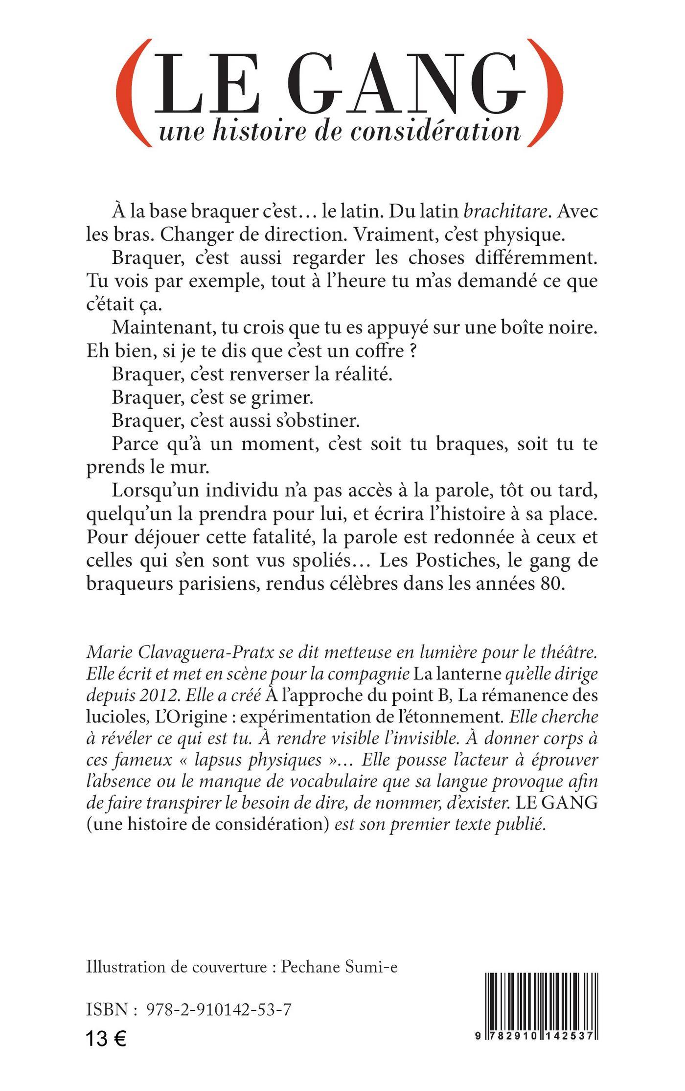 À la base braquer c’est... le latin. Du latin brachitare. Avec les bras. Changer de direction. Vraiment, c’est physique.Braquer, c’est aussi regarder les choses différemment. Tu vois par exemple, tout à l’heure tu m’as demandé ce que c’était ça. Maintenant, tu crois que tu es appuyé sur une boîte noire. Eh bien, si je te dis que c’est un coffre ? Braquer, c’est renverser la réalité. Braquer, c’est se grimer. Braquer, c’est aussi s’obstiner. Parce qu’à un moment, c’est soit tu braques, soit tu te prends le mur. Lorsqu’un individu n’a pas accès à la parole, tôt ou tard, quelqu’un la prendra pour lui, et écrira l’histoire à sa place. Pour déjouer cette fatalité, la parole est redonnée à ceux et celles qui s’en sont vus spoliés... Les Postiches, le gang de braqueurs parisiens, rendus célèbres dans les années 80.