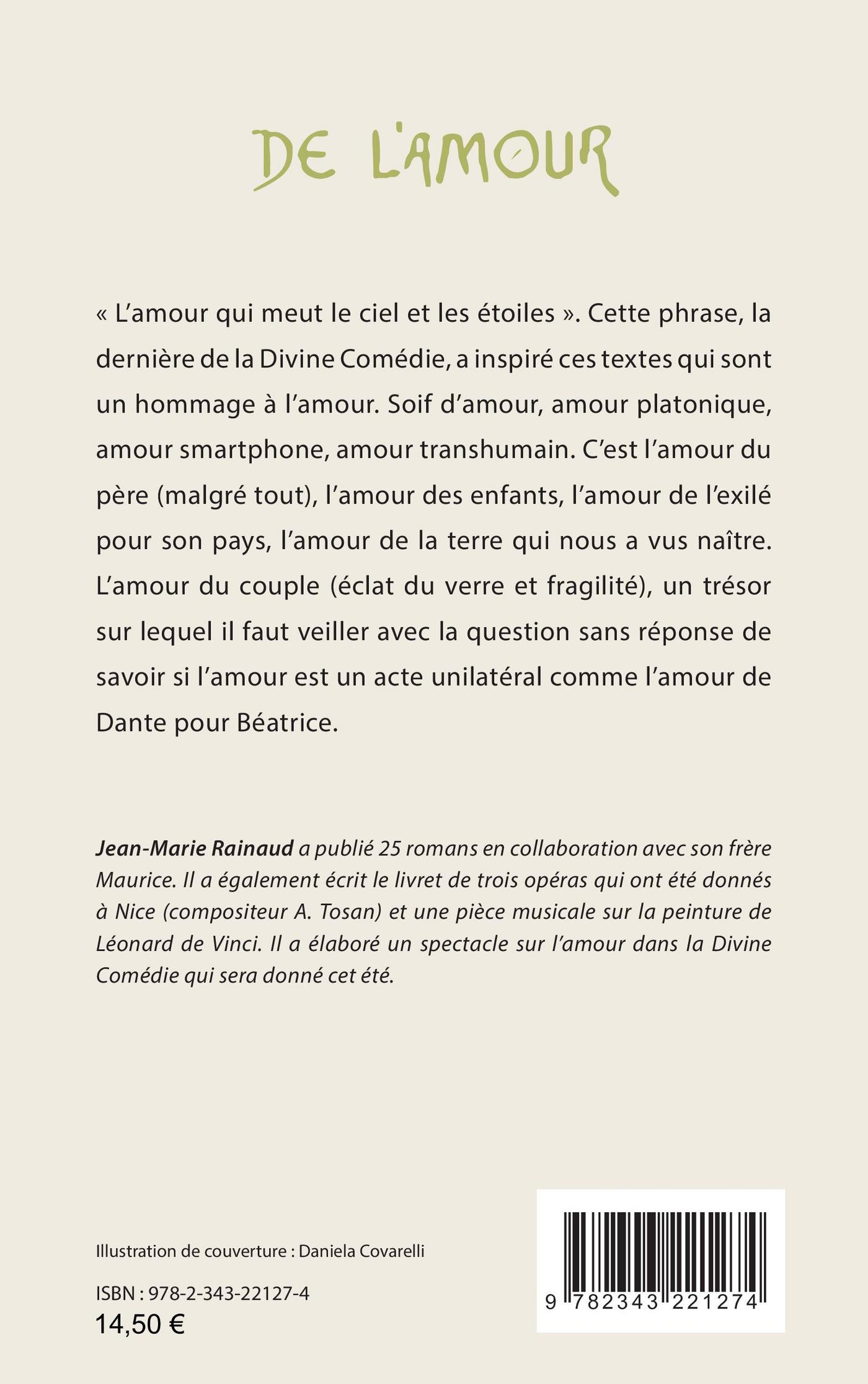 « L’amour qui meut le ciel et les étoiles ». Cette phrase, la dernière de la Divine Comédie, a inspiré ces textes qui sont un hommage à l’amour. Soif d’amour, amour platonique, amour smartphone, amour transhumain. C’est l’amour du père (malgré tout), l’amour des enfants, l’amour de l’exilé pour son pays, l’amour de la terre qui nous a vus naître. L’amour du couple (éclat du verre et fragilité), un trésor sur lequel il faut veiller avec la question sans réponse de savoir si l’amour est un acte unilatéral comme l’amour de Dante pour Béatrice.