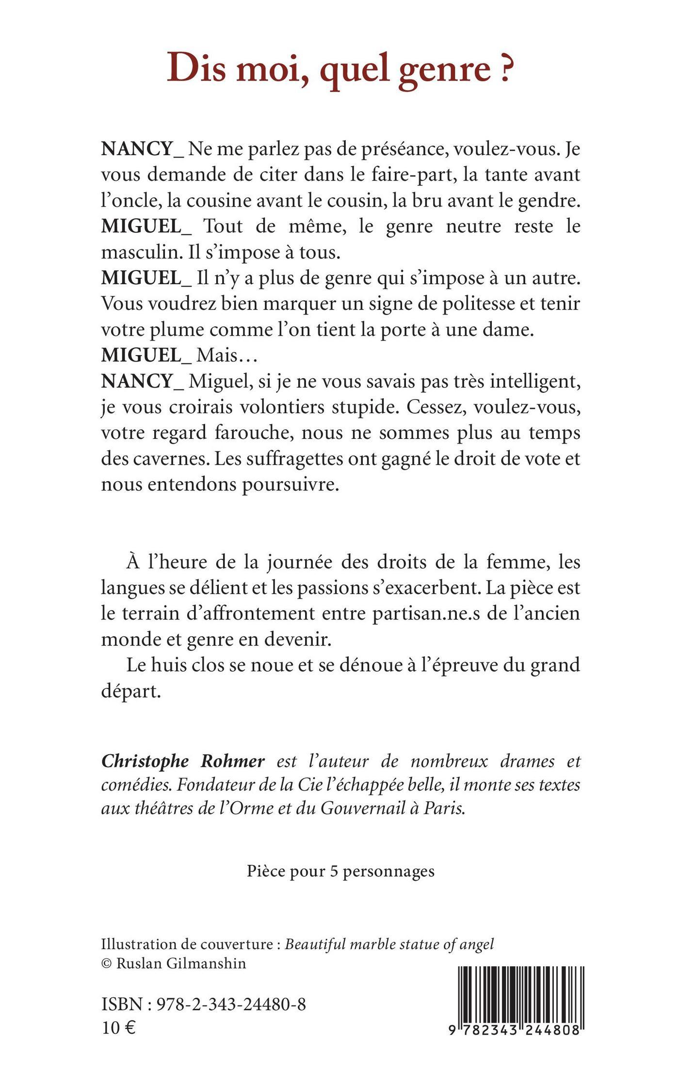 NANCY_ Ne me parlez pas de préséance, voulez-vous. Je vous demande de citer dans le faire-part, la tante avant l'oncle, la cousine avant le cousin, la bru avant le gendre.MIGUEL_ Tout de même, le genre neutre reste le masculin. Il s'impose à tous.MIGUEL_ Il n'y a plus de genre qui s'impose à un autre. Vous voudrez bien marquer un signe de politesse et tenir votre plume comme l'on tient la porte à une dame.MIGUEL_ Mais...NANCY_ Miguel, si je ne vous savais pas très intelligent, je vous croirais volontiers stupide. Cessez, voulez-vous, votre regard farouche, nous ne sommes plus au temps des cavernes. Les suffragettes ont gagné le droit de vote et nous entendons poursuivre.À l'heure de la journée des droits de la femme, les langues se délient et les passions s'exacerbent. La pièce est le terrain d'affrontement entre partisan.ne.s de l'ancien monde et genre en devenir. Le huis clos se noue et se dénoue à l'épreuve du grand départ.