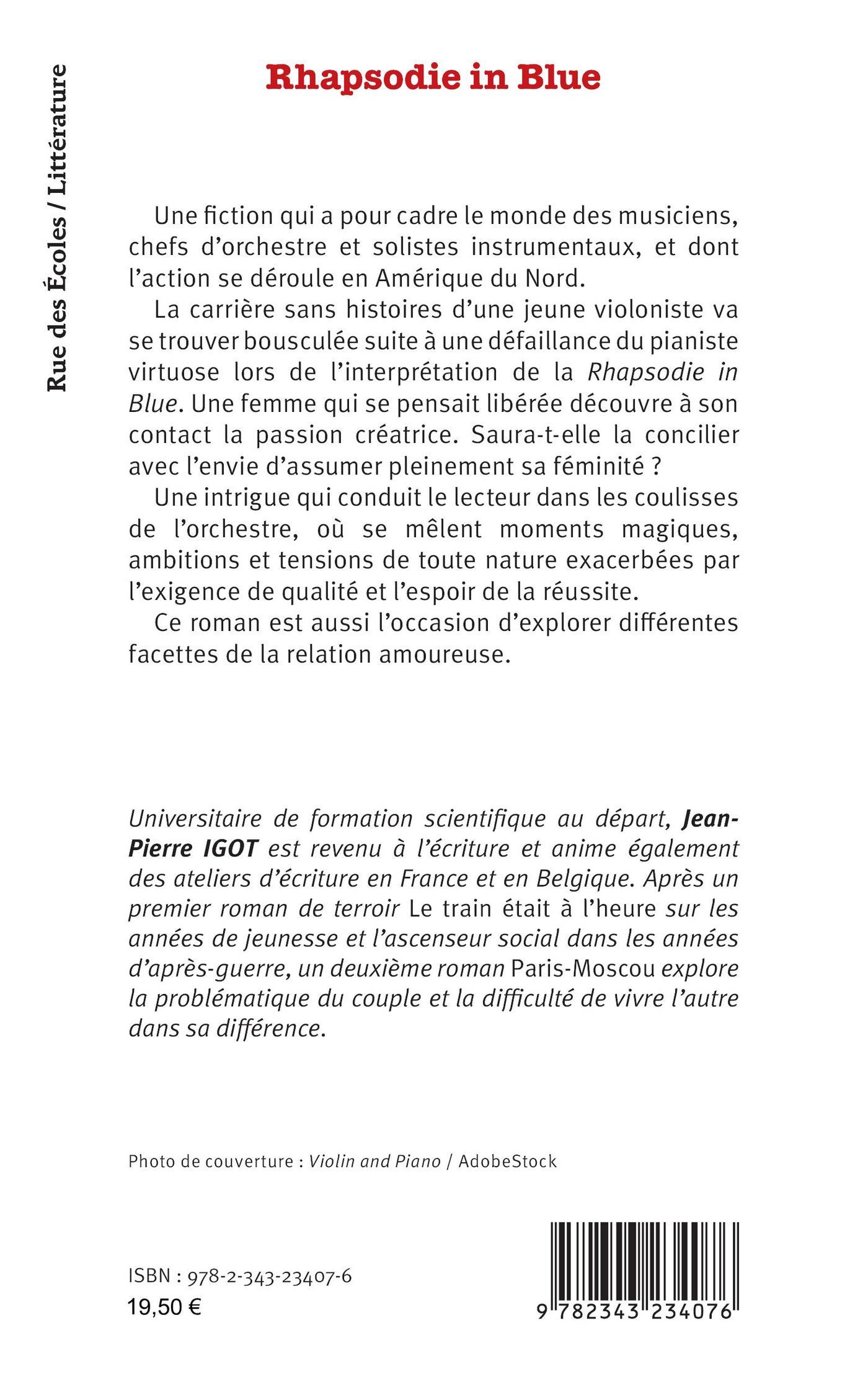 Une fiction qui a pour cadre le monde des musiciens, chefs d’orchestre et solistes instrumentaux, et dont l’action se déroule en Amérique du Nord. La carrière sans histoires d’une jeune violoniste va se trouver bousculée suite à une défaillance du pianiste virtuose lors de l’interprétation de la Rhapsodie in Blue. Une femme qui se pensait libérée découvre à son contact la passion créatrice. Saura-t-elle la concilier avec l’envie d’assumer pleinement sa féminité ? Une intrigue qui conduit le lecteur dans les coulisses de l’orchestre, où se mêlent moments magiques, ambitions et tensions de toute nature exacerbées par l’exigence de qualité et l’espoir de la réussite.