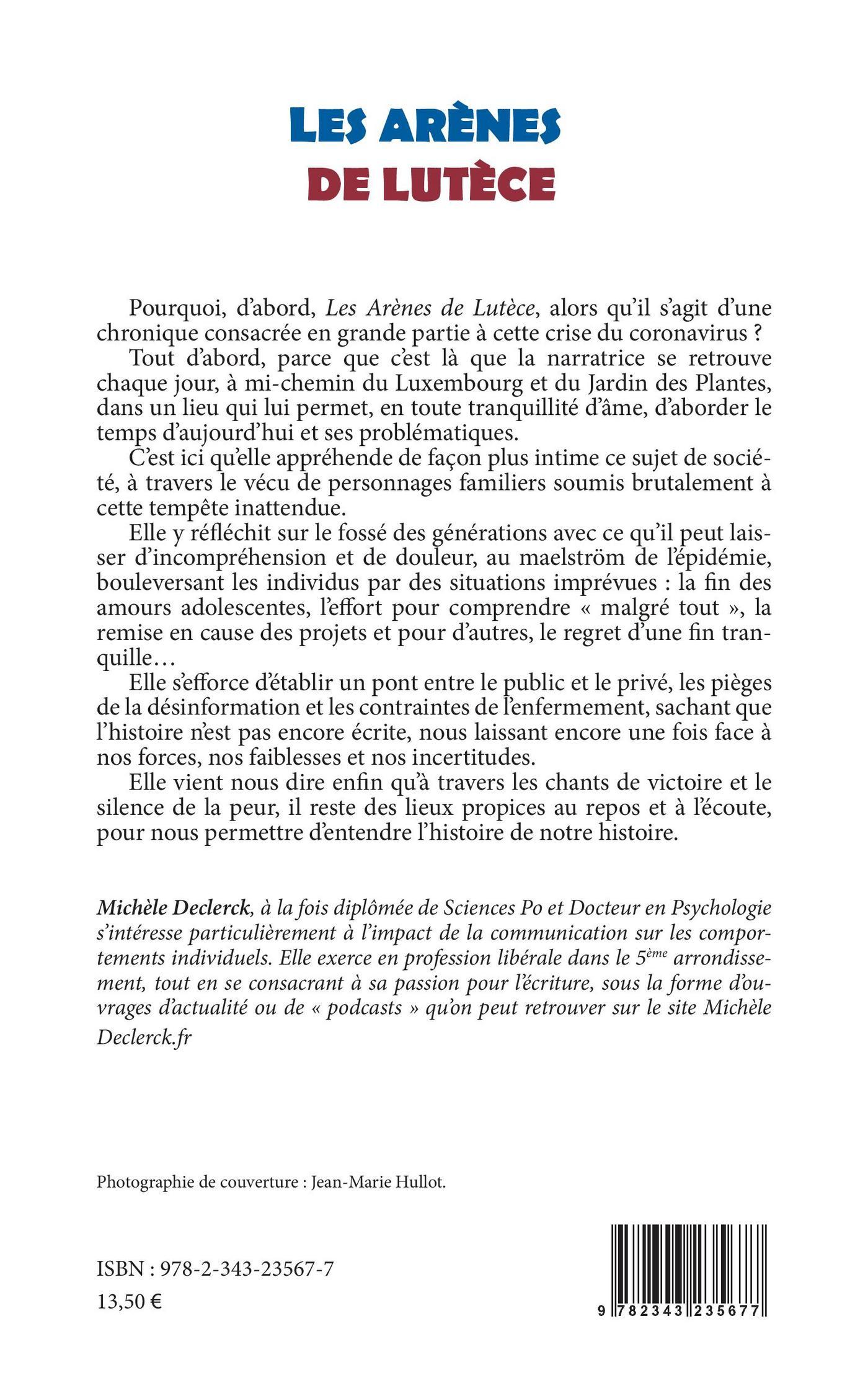 Pourquoi, d'abord, Les Arènes de Lutèce, alors qu'il s'agit d'une chronique consacrée en grande partie à cette crise du coronavirus ? Tout d'abord, parce que c'est là que la narratrice se retrouve chaque jour, à mi-chemin du Luxembourg et du Jardin des Plantes, dans un lieu qui lui permet, en toute tranquillité d'âme, d'aborder le temps d'aujourd'hui et ses problématiques. Elle s'efforce d'établir un pont entre le public et le privé, les pièges de la désinformation et les contraintes de l'enfermement, sachant que l'histoire n'est pas encore écrite, nous laissant encore une fois face à nos forces, nos faiblesses et nos incertitudes. Elle vient nous dire enfin qu'à travers les chants de victoire et le silence de la peur, il reste des lieux propices au repos et à l'écoute, pour nous permettre d'entendre l'histoire de notre histoire.