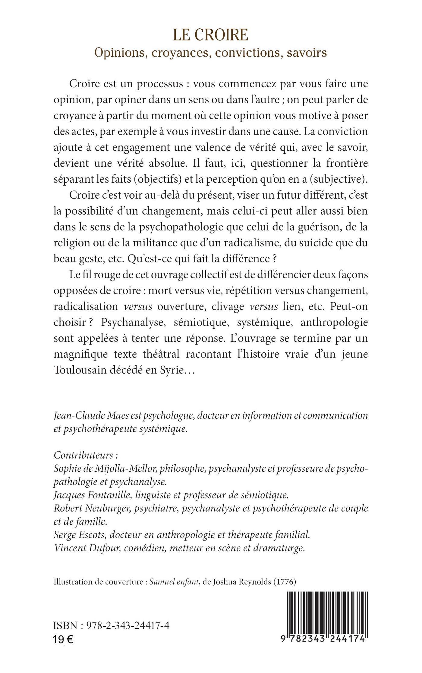 Croire est un processus : vous commencez par vous faire une opinion, par opiner dans un sens ou dans l’autre ; on peut parler de croyance à partir du moment où cette opinion vous motive à poser des actes, par exemple à vous investir dans une cause. La conviction ajoute à cet engagement une valence de vérité qui, avec le savoir, devient une vérité absolue. Il faut, ici, questionner la frontière séparant les faits (objectifs) et la perception qu’on en a (subjective). Croire c’est voir au-delà du présent, viser un futur différent, c’est la possibilité d’un changement, mais celui-ci peut aller aussi bien dans le sens de la psychopathologie que celui de la guérison, de la religion ou de la militance que d’un radicalisme, du suicide que du beau geste, etc. Qu’est-ce qui fait la différence ? Le fil rouge de cet ouvrage collectif est de différencier deux façons opposées de croire : mort versus vie, répétition versus changement, radicalisation versus ouverture, clivage versus lien, etc. Peut-on choisir ? Psychanalyse, sémiotique, systémique, anthropologie sont appelées à tenter une réponse. L’ouvrage se termine par un magnifique texte théâtral racontant l’histoire vraie d’un jeune Toulousain décédé en Syrie..