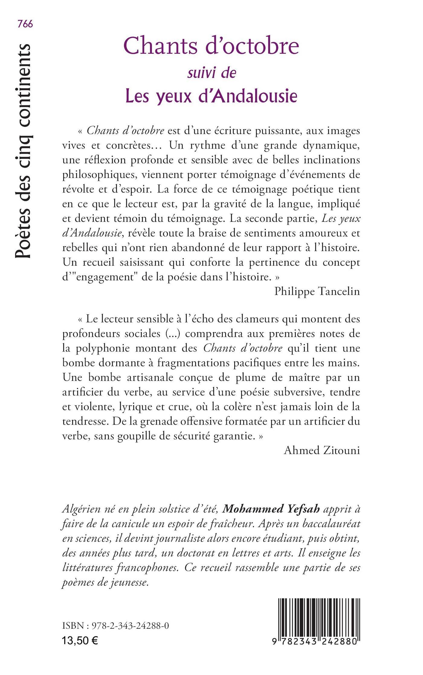 « Chants d’octobre est d’une écriture puissante, aux images vives et concrètes... Un rythme d’une grande dynamique, une réflexion profonde et sensible avec de belles inclinations philosophiques, viennent porter témoignage d’événements de révolte et d’espoir. La force de ce témoignage poétique tient en ce que le lecteur est, par la gravité de la langue, impliqué et devient témoin du témoignage. La seconde partie, Les yeux d’Andalousie, révèle toute la braise de sentiments amoureux et rebelles qui n’ont rien abandonné de leur rapport à l’histoire. Un recueil saisissant qui conforte la pertinence du concept d’"engagement" de la poésie dans l’histoire. »Philippe Tancelin