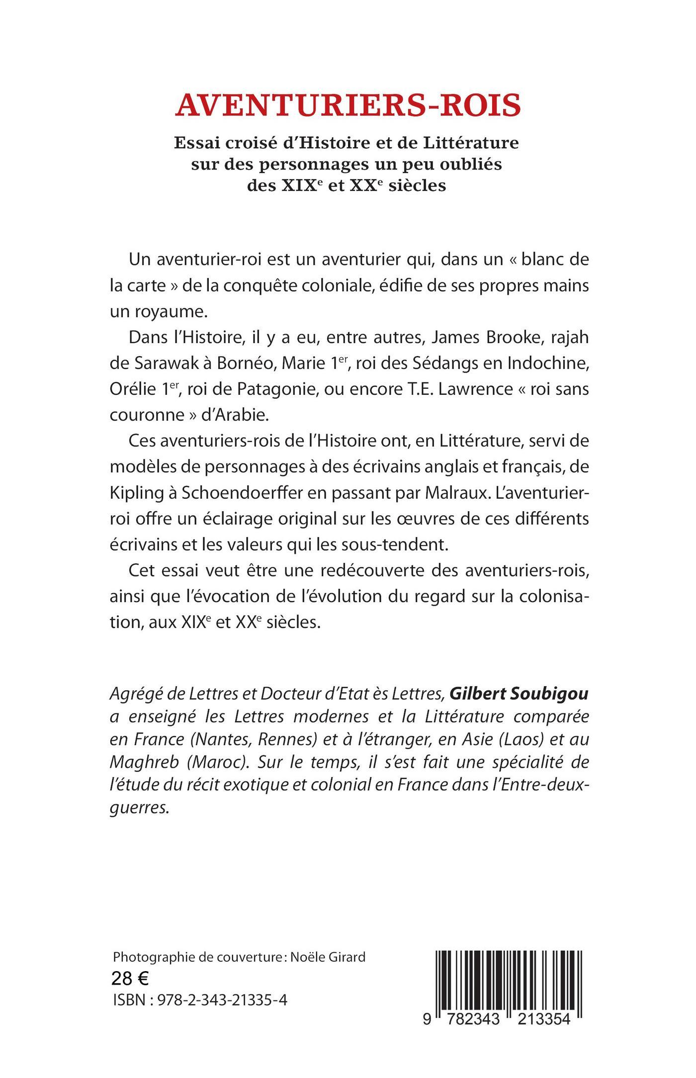 Un aventurier-roi est un aventurier qui, dans un « blanc de la carte » de la conquête coloniale, édifie de ses propres mains un royaume. Dans l’Histoire, il y a eu, entre autres, James Brooke, rajahde Sarawak à Bornéo, Marie 1er, roi des Sédangs en Indochine, Orélie 1er, roi de Patagonie, ou encore T.E. Lawrence « roi sans couronne » d’Arabie. Ces aventuriers-rois de l’Histoire ont, en Littérature, servi de modèles de personnages à des écrivains anglais et français, de Kipling à Schoendoerffer en passant par Malraux. L’aventurier-roi offre un éclairage original sur les oeuvres de ces différents écrivains et les valeurs qui les sous-tendent. Cet essai veut être une redécouverte des aventuriers-rois, ainsi que l’évocation de l’évolution du regard sur la colonisation, aux XIXe et XXe siècles.