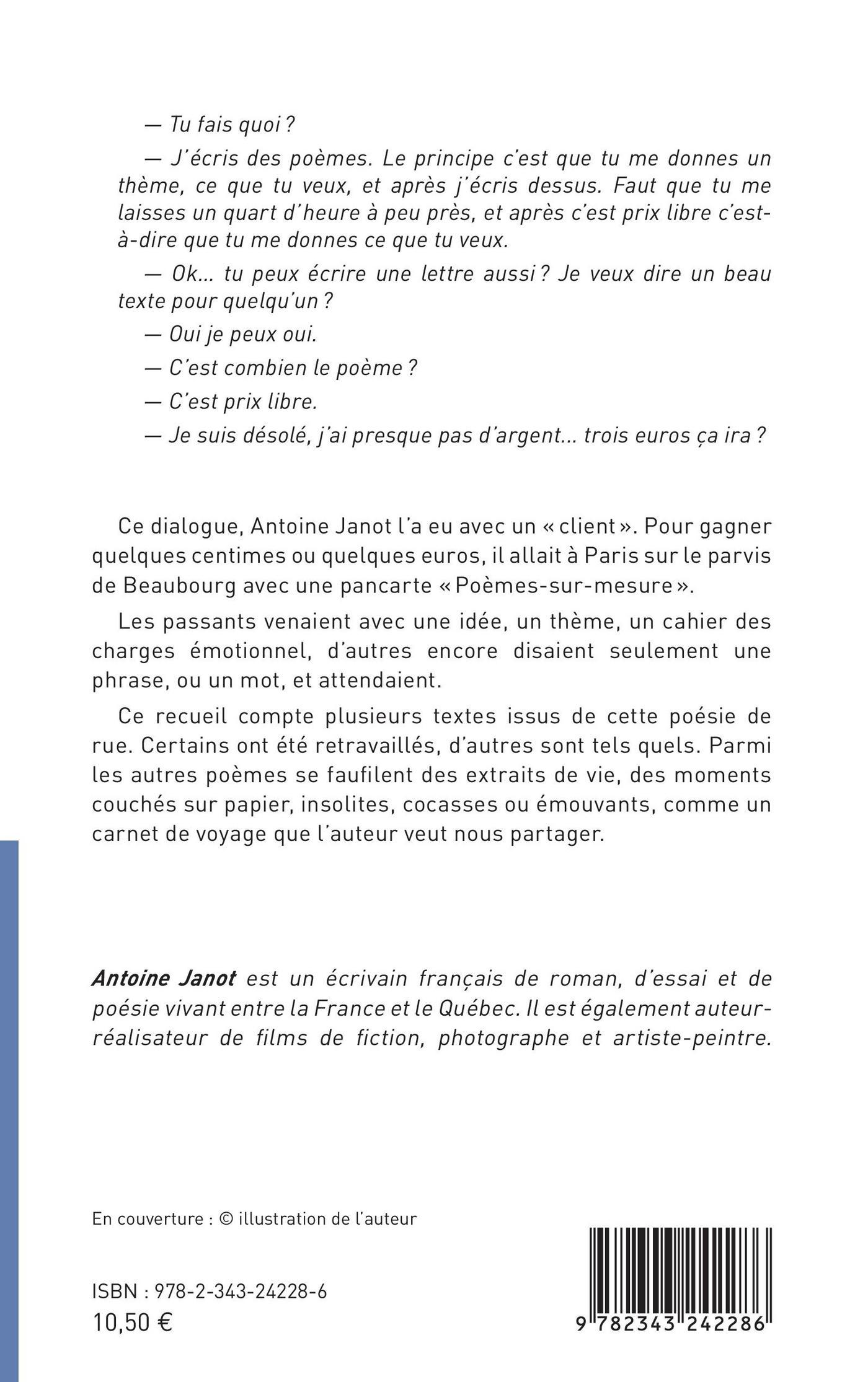 Tu fais quoi ? J'écris des poèmes. Le principe c'est que tu me donnes un thème, ce que tu veux, et après j'écris dessus. Faut que tu me laisses un quart d'heure à peu près, et après c'est prix libre c'està-dire que tu me donnes ce que tu veux. Ok... tu peux écrire une lettre aussi ? Je veux dire un beau texte pour quelqu'un ?- Oui je peux, oui.- C'est combien le poème ?- C'est prix libre.- Je suis désolé, j'ai presque pas d'argent... trois euros ça ira ?Ce dialogue, Antoine Janot l'a eu avec un « client ». Pour gagner quelques centimes ou quelques euros, il allait à Paris sur le parvis de Beaubourg avec une pancarte « Poèmes-sur-mesure ». Les passants venaient avec une idée, un thème, un cahier des charges émotionnel, d'autres encore disaient seulement une phrase, ou un mot, et attendaient. Ce recueil compte plusieurs textes issus de cette poésie derue. Certains ont été retravaillés, d'autres sont tels quels. Parmi les autres poèmes se faufilent des extraits de vie, des moments couchés sur papier, insolites, cocasses ou émouvants, comme un carnet de voyage que l'auteur veut nous partager.