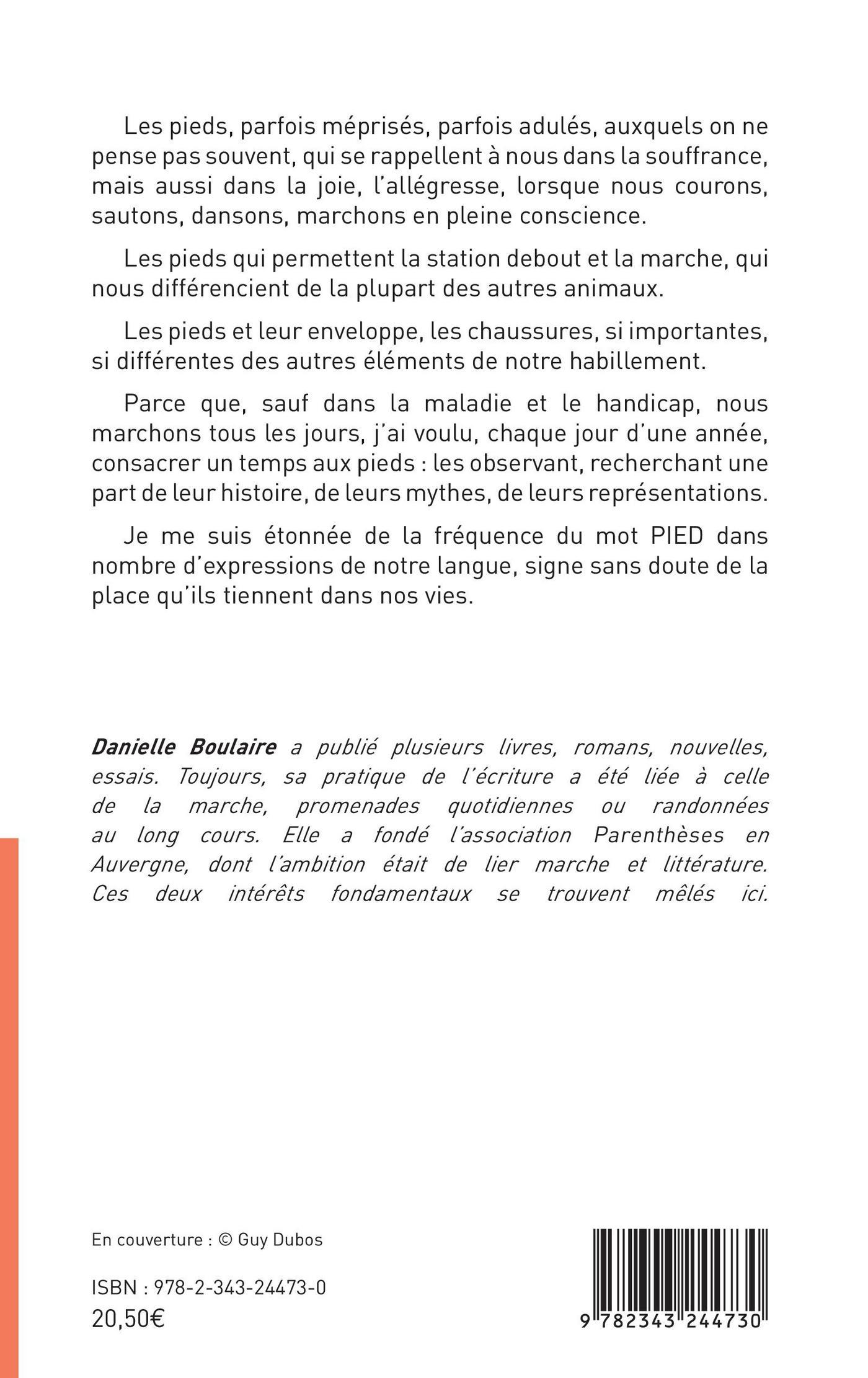 Les pieds, parfois méprisés, parfois adulés, auxquels on ne pense pas souvent, qui se rappellent à nous dans la souffrance, mais aussi dans la joie, l'allégresse, lorsque nous courons, sautons, dansons, marchons en pleine conscience. Les pieds qui permettent la station debout et la marche, qui nous différencient de la plupart des autres animaux. Les pieds et leur enveloppe, les chaussures, si importantes,si différentes des autres éléments de notre habillement. Parce que, sauf dans la maladie et le handicap, nous marchons tous les jours, j'ai voulu, chaque jour d'une année, consacrer un temps aux pieds : les observant, recherchant une part de leur histoire, de leurs mythes, de leurs représentations. Je me suis étonnée de la fréquence du mot PIED dans nombre d'expressions de notre langue, signe sans doute de laplace qu'ils tiennent dans nos vies.