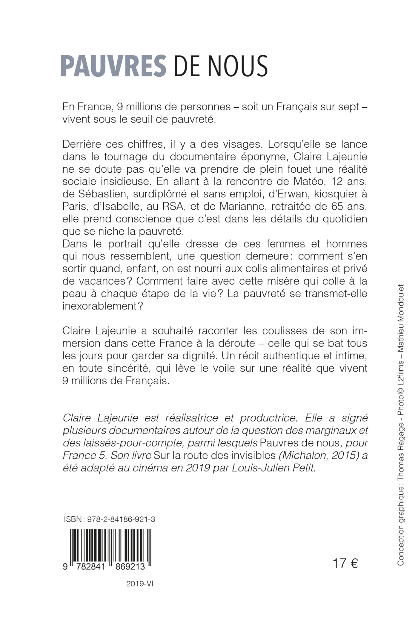 En France, 9 millions de personnes soit un Français sur sept vivent sous le seul de pauvreté.Derrière ces chiffres, il y a des visages. Lorsqu'elle se lance dans le tournage du documentaire éponyme, Claire Lajeunie ne se doute pas qu'elle va prendre de plein fouet une réalité sociale insidieuse. En allant à la rencontre de Matéo, 12 ans, de Sébastien, surdiplômé et sans emploi, d'Erwan, kiosquier à Paris, d'Isabelle, au RSA, et de Marianne, retraitée de 65 ans, elle prend conscience que c'est dans les détails du quotidien que se niche la pauvreté.Dans le portrait qu'elle dresse de ces femmes et hommes qui nous ressemblent, une question demeure : comment s'en sortir quand, enfant, on est nourri aux colis alimentaires et privé de vacances ? Comment faire avec cette misère qui colle à la peau à chaque étape de la vie ? La pauvreté se transmet-elle inexorablement ?Claire Lajeunie a souhaité raconter les coulisses de son immersion dans cette France à la déroute celle qui se bat tous les jours pour garder sa dignité. Un récit authentique et intime, en toute sincérité, qui lève le voile sur une réalité que vivent 9 millions de Français.