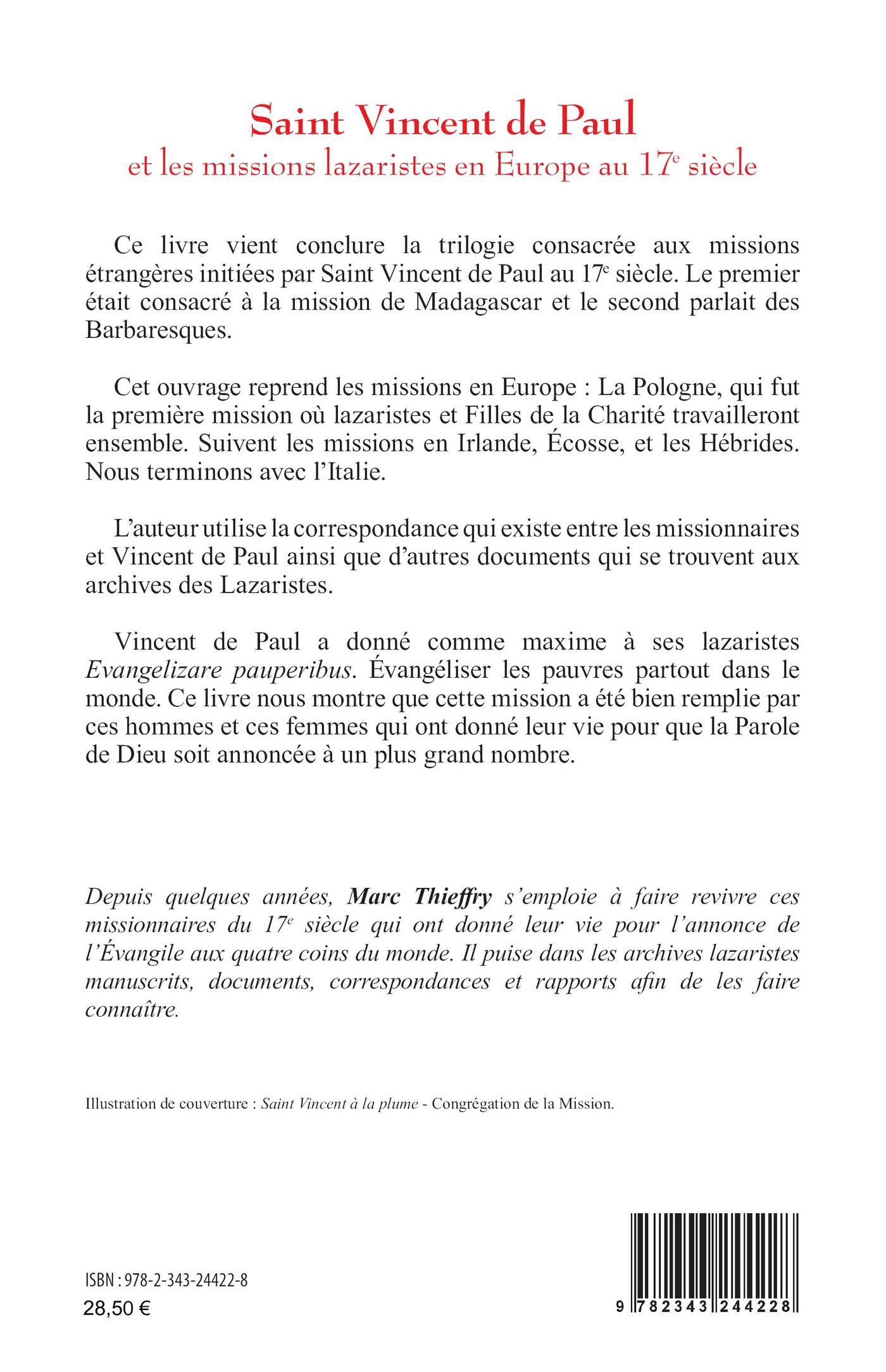 Cet ouvrage vient conclure la trilogie consacrée aux missions étrangères initiées par Saint Vincent de Paul au 17e siècle. Le premier était consacré à la mission de Madagascar et le second parlait des Barbaresques. Ce nouvel opus reprend les missions en Europe : la Pologne, qui fut la première mission où lazaristes et Filles de la Charité travailleront ensemble. Suivent les missions en Irlande, Écosse, les Hébrides et l’Italie. L’auteur utilise la correspondance qui existe entre les missionnaires et Vincent de Paul ainsi que d’autres documents qui se trouvent aux archives des Lazaristes. Vincent de Paul a donné comme maxime à ses lazaristes Evangelizare pauperibus. Évangéliser les pauvres partout dans le monde. Cette mission a été bien remplie par ces hommes et ces femmes qui ont donné leur vie pour que la Parole de Dieu soit annoncée à un plus grand nombre.