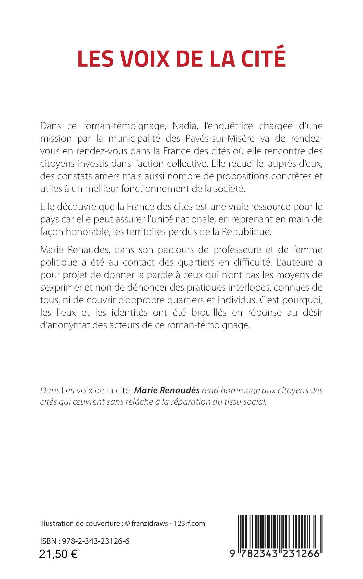 Dans ce roman-témoignage, Nadia, l’enquêtrice chargée d’une mission par la municipalité des Pavés-sur-Misère va de rendez-vous en rendez-vous dans la France des cités où elle rencontre des citoyens investis dans l’action collective. Elle recueille, auprès d’eux, des constats amers mais aussi nombre de propositions concrètes et utiles à un meilleur fonctionnement de la société. Elle découvre que la France des cités est une vraie ressource pour le pays car elle peut assurer l’unité nationale, en reprenant en main de façon honorable, les territoires perdus de la République. Marie Renaudès, dans son parcours de professeure et de femme politique a été au contact des quartiers en difficulté. L’auteure a pour projet de donner la parole à ceux qui n’ont pas les moyens de s’exprimer et non de dénoncer des pratiques interlopes, connues de tous, ni de couvrir d’opprobre quartiers et individus. C’est pourquoi, les lieux et les identités ont été brouillés en réponse au désir d’anonymat des acteurs de ce roman-témoignage.