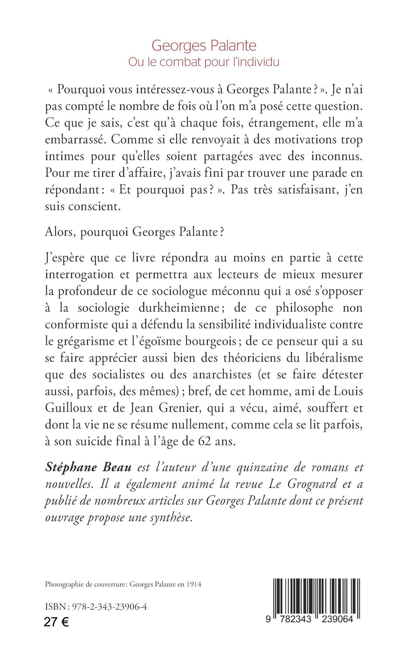 Pourquoi s'intéresser à Georges Palante ? Cet ouvrage répondra au moins en partie à cette interrogation. Il permettra aux lecteurs de mieux mesurer la profondeur de ce sociologue méconnu qui a osé s’opposer à la sociologie durkheimienne ; de ce philosophe non conformiste qui a défendu la sensibilité individualiste contre le grégarisme et l’égoïsme bourgeois ; de ce penseur qui a su se faire apprécier aussi bien des théoriciens du libéralisme que des socialistes ou des anarchistes (et se faire détester aussi, parfois, des mêmes) ; bref, de cet homme, ami de Louis Guilloux et de Jean Grenier, qui a vécu, aimé, souffert et dont la vie ne se résume nullement, comme cela se lit parfois, à son suicide final à l’âge de 62 ans.