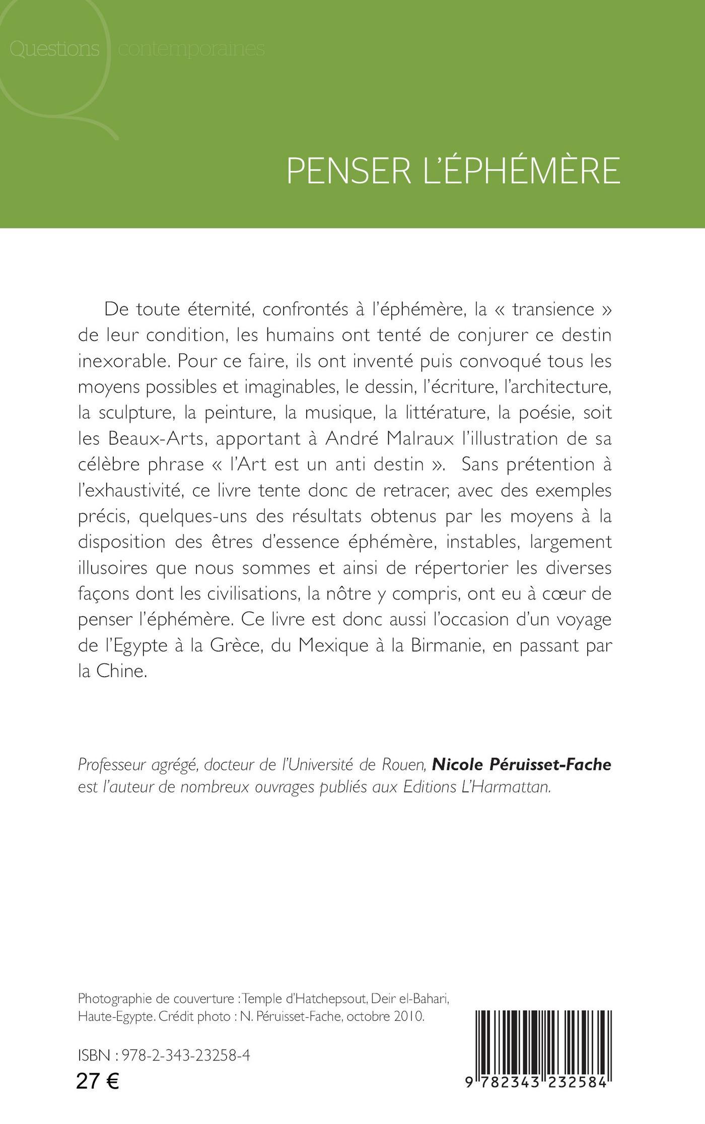 De toute éternité, confrontés à l’éphémère, la « transience » de leur condition, les humains ont tenté de conjurer ce destin inexorable. Pour ce faire, ils ont inventé puis convoqué tous les moyens possibles et imaginables, le dessin, l’écriture, l’architecture, la sculpture, la peinture, la musique, la littérature, la poésie, soit les Beaux-Arts, apportant à André Malraux l’illustration de sa célèbre phrase « l’Art est un anti destin ». Sans prétention à l’exhaustivité, cette réflexion tente donc de retracer quelques-uns des résultats obtenus par les moyens à la disposition des êtres d’essence éphémère, instables, largement illusoires que nous sommes et ainsi de répertorier les diverses façons dont les civilisations, la nôtre y compris, ont eu à coeur de penser l’éphémère. Cet ouvrage est donc aussi l’occasion d’un voyage de l’Egypte à la Grèce, du Mexique à la Birmanie, en passant par la Chine.