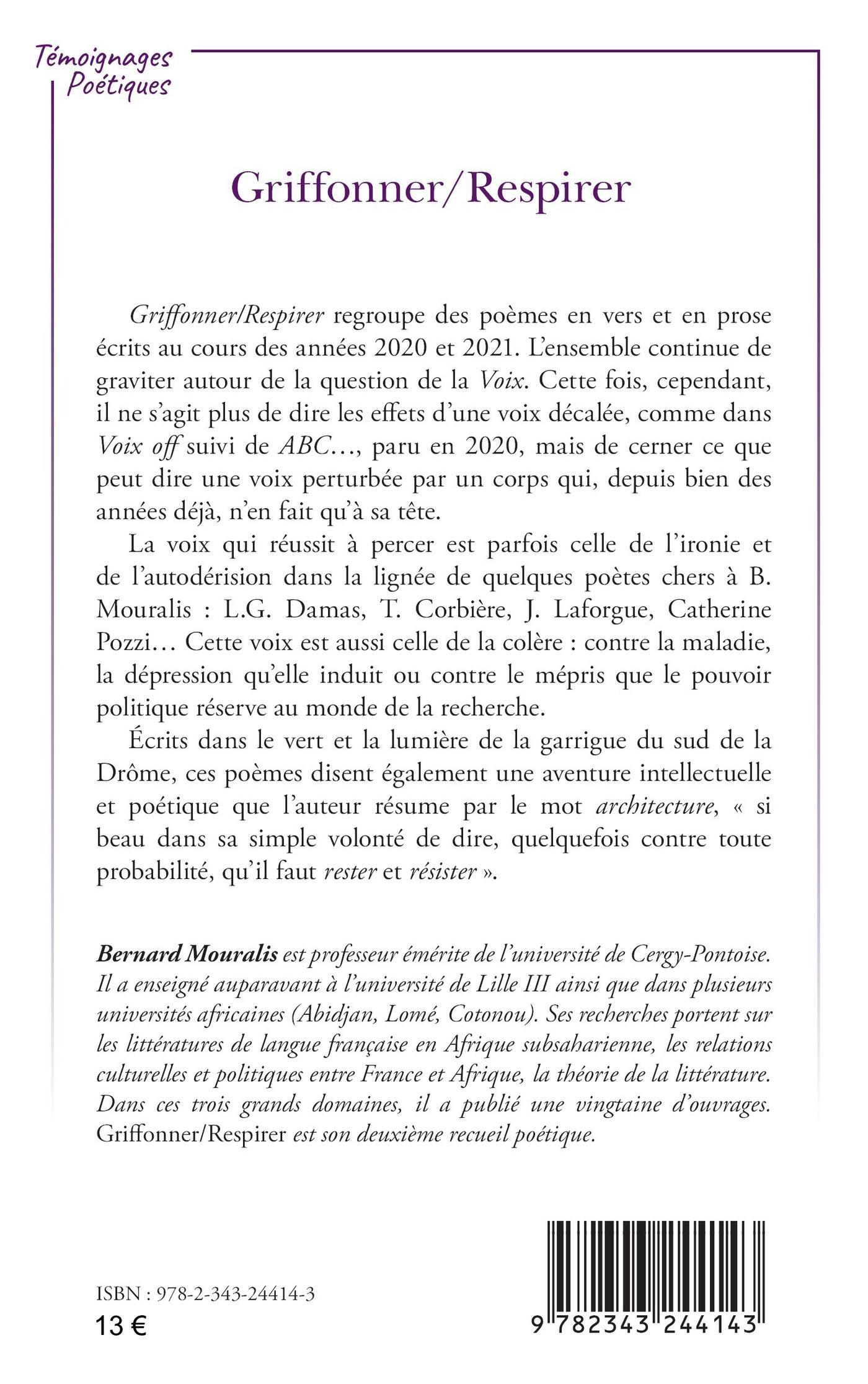 Griffonner/Respirer regroupe des poèmes en vers et en prose écrits au cours des années 2020 et 2021. L’ensemble continue de graviter autour de la question de la Voix. Cette fois, cependant, il ne s’agit plus de dire les effets d’une voix décalée, comme dans Voix off suivi de ABC..., paru en 2020, mais de cerner ce que peut dire une voix perturbée par un corps qui, depuis bien des années déjà, n’en fait qu’à sa tête. Écrits dans le vert et la lumière de la garrigue du sud de la Drôme, ces poèmes disent également une aventure intellectuelle et poétique que l’auteur résume par le mot architecture, « si beau dans sa simple volonté de dire, quelquefois contre toute probabilité, qu’il faut rester et résister ».