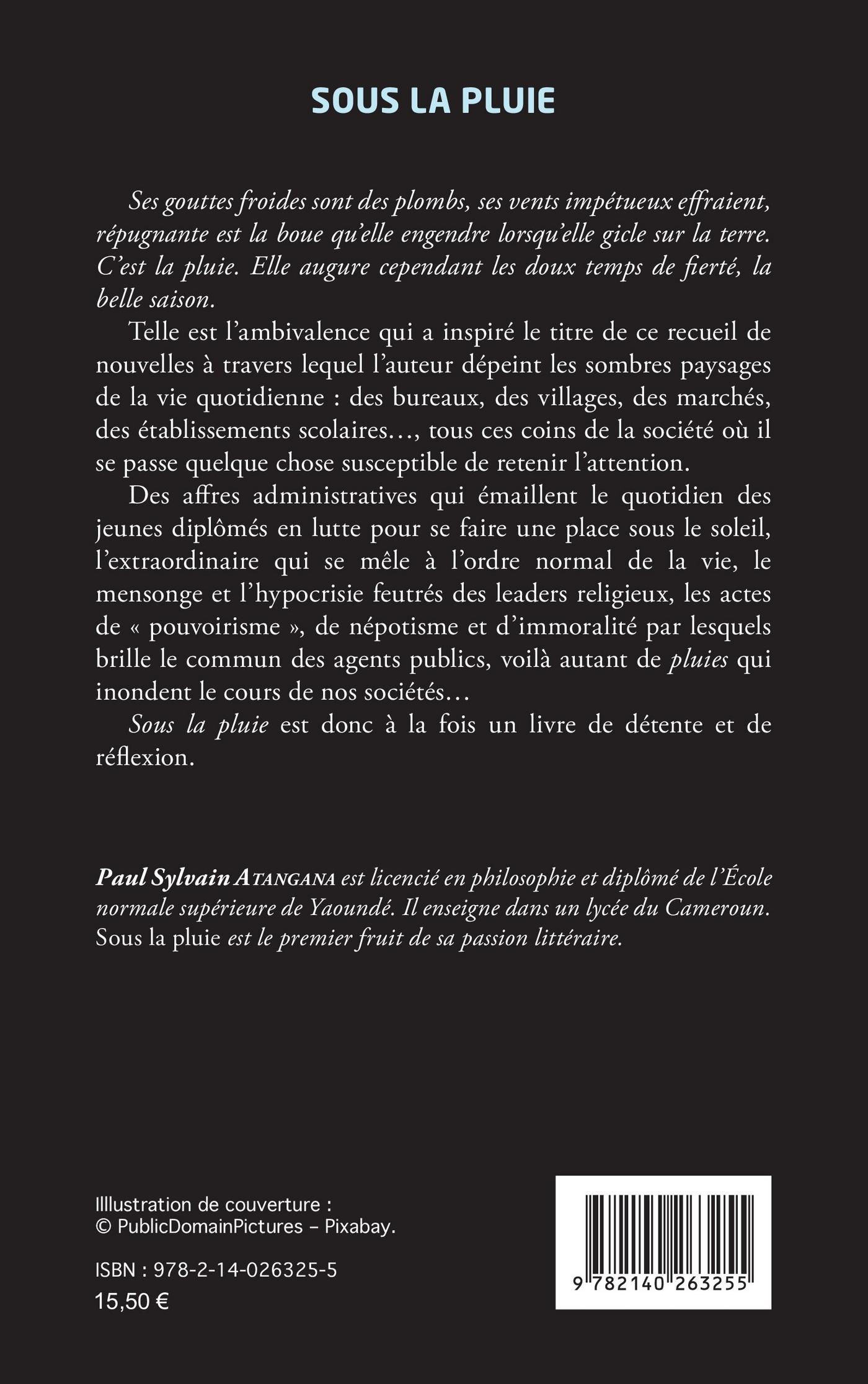 Ses gouttes froides sont des plombs, ses vents impétueux effraient, répugnante est la boue qu’elle engendre lorsqu’elle gicle sur la terre. C’est la pluie. Elle augure cependant les doux temps de fierté, la belle saison. Telle est l’ambivalence qui a inspiré le titre de ce recueil de nouvelles à travers lequel l’auteur dépeint les sombres paysages de la vie quotidienne : des bureaux, des villages, des marchés, des établissements scolaires..., tous ces coins de la société où il se passe quelque chose susceptible de retenir l’attention. Des affres administratives qui émaillent le quotidien des jeunes diplômés en lutte pour se faire une place sous le soleil, l’extraordinaire qui se mêle à l’ordre normal de la vie, le mensonge et l’hypocrisie feutrés des leaders religieux, les actes de « pouvoirisme », de népotisme et d’immoralité par lesquels brille le commun des agents publics, voilà autant de pluies qui inondent le cours de nos sociétés...