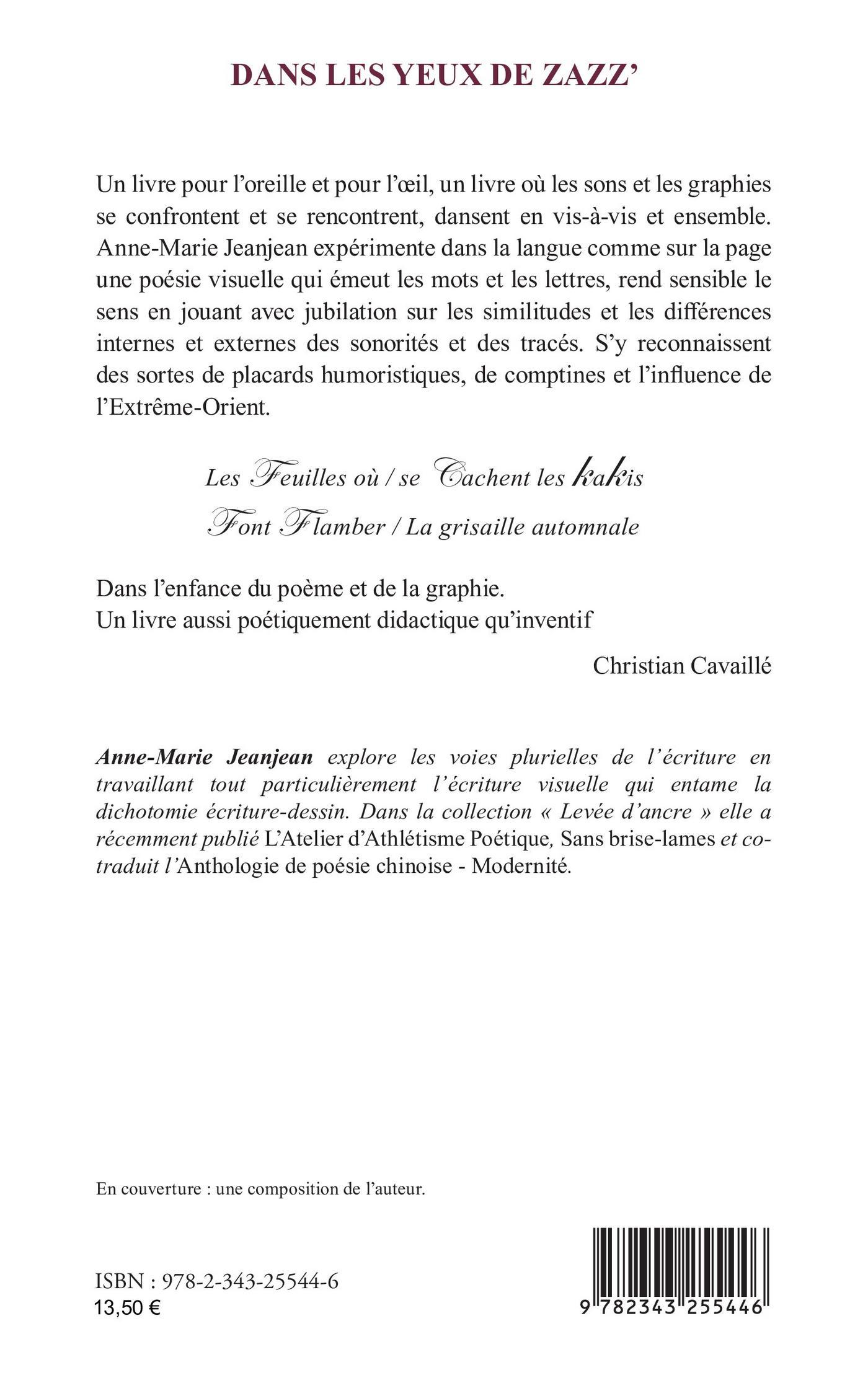 Un livre pour l’oreille et pour l’oeil, un livre où les sons et les graphies se confrontent et se rencontrent, dansent en vis-à-vis et ensemble. Anne-Marie Jeanjean expérimente dans la langue comme sur la page une poésie visuelle qui émeut les mots et les lettres, rend sensible le sens en jouant avec jubilation sur les similitudes et les différences internes et externes des sonorités et des tracés. S’y reconnaissent des sortes de placards humoristiques, de comptines et l’influence de l’Extrême-Orient. Dans l’enfance du poème et de la graphie.Un livre aussi poétiquement didactique qu’inventif.Christian Cavaillé